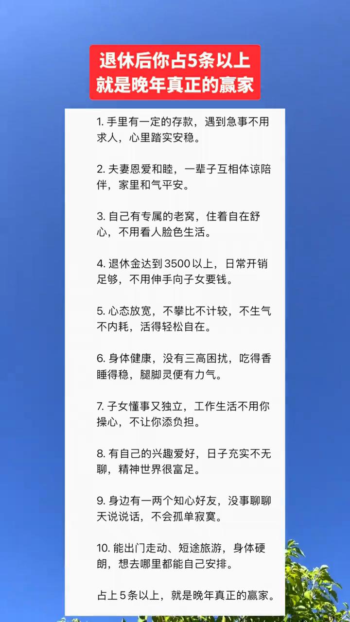 退休后你占5条以上就是晚年真正的赢家。 ·1.手里有一定的存款,遇到急事不用求人,心里踏实安稳。 ·2.夫妻恩爱和睦,一辈子互相体谅陪伴,家里和气平安。 ·3.自己有专属的老窝,住着自在舒心,不用看人脸色生活。 ·4.退休金达到3500以上,日常开销足够,不用伸手向子女要钱。 ·5.心态放宽,不攀比、不计较、不生气、不内耗,活得轻松自在。 ·6.身体健康,没有三高困扰,吃得香、睡得稳,腿脚灵便有力气。 ·7.子女懂事又独立,工作生活不用你操心,不让你添负担。 ·8.有自己的兴趣爱好,日子充实不无聊,精神世界很富足。 ·9.身边有一两个知心好友,没事聊聊天说说话,不会孤单寂寞。 ·10.能出门走动、短途旅游,身体硬朗,想去哪里都能自己安排。 占上5条以上就是晚年真正的赢家。
