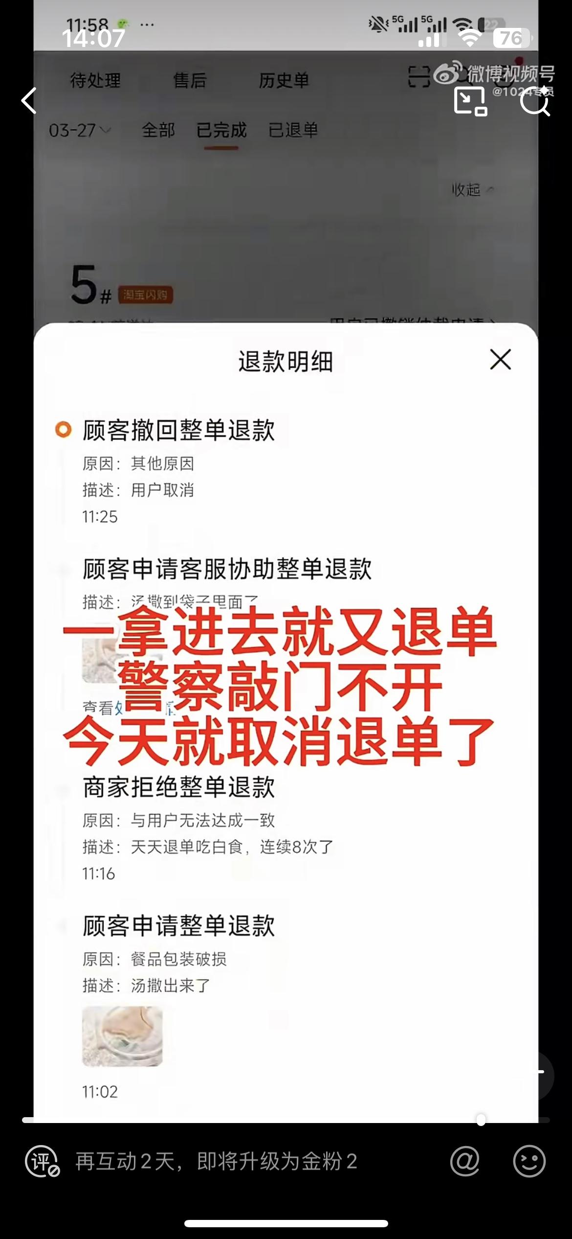 武汉一商家追踪多次白嫖顾客上门,报警求助,无奈喊门不开,警察只能走了。面对这样经常吃白食的人,有什么办法可以治他?商家已经怕他了,他已经多次白嫖,每次吃完了都以各种理由退款,比如餐食洒了,超时了等等。每一次商家打包他的餐食都非常谨慎,保证餐盒结实,不会有任何问题,就是为了防止他退款。这一次商家找上门,他本来选择了要退款,但是后来又撤回了。