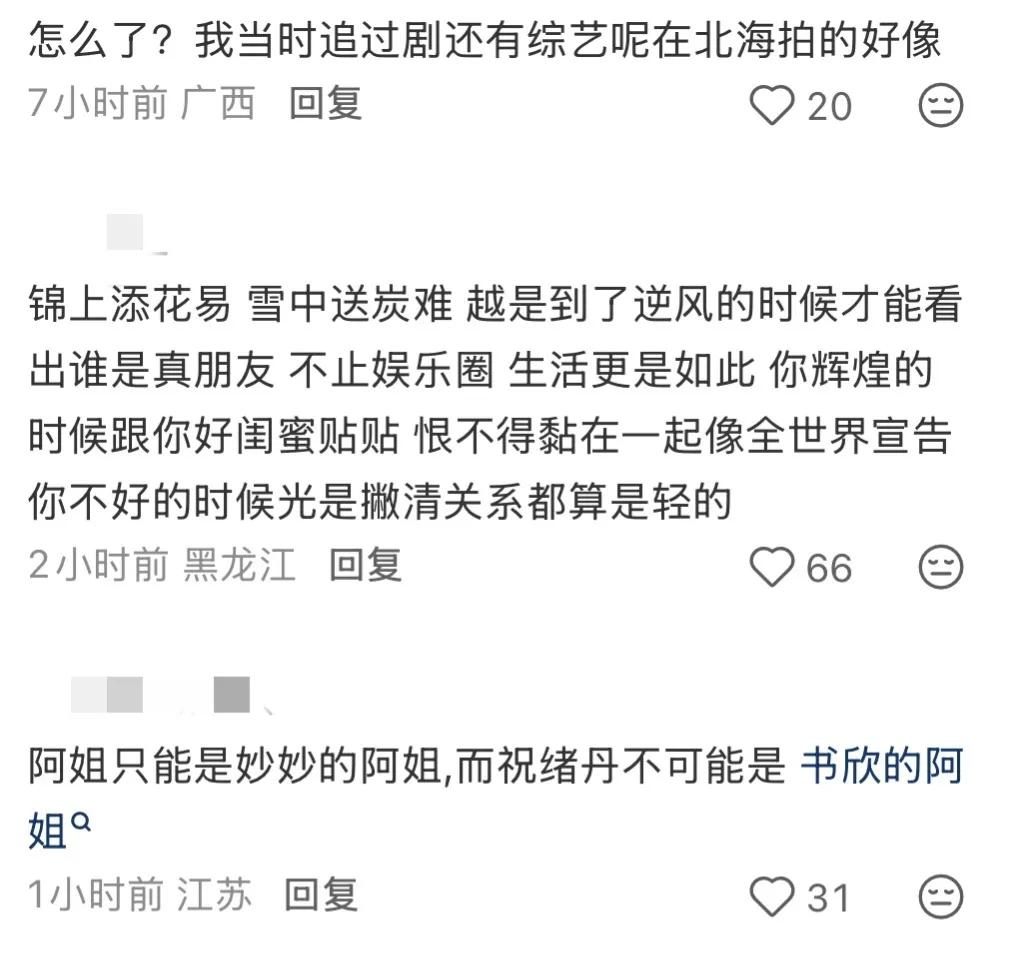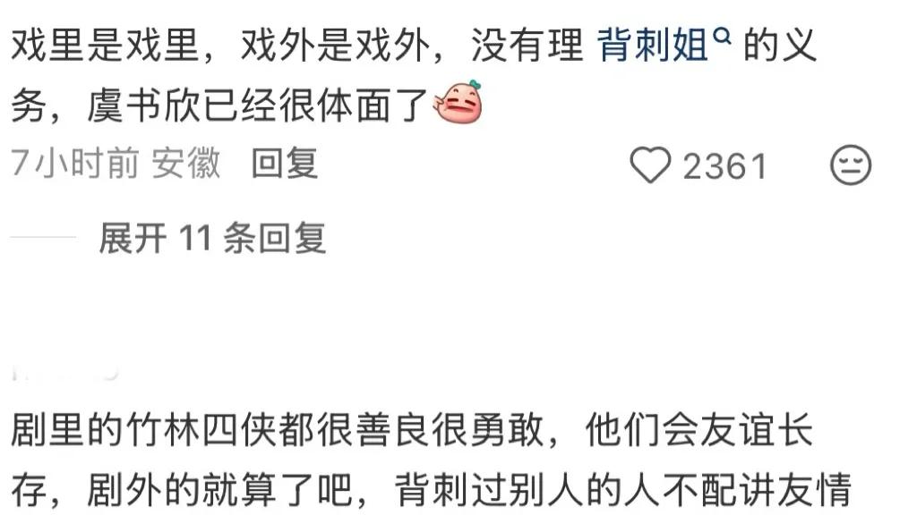 虞书欣、祝绪丹疑似闹掰。 这两天刷到虞书欣和祝绪丹同场活动的视频,满心期待能看到“竹林四侠”合体,结果…零互动…… 眼神交流🈚️ 同框擦肩🈚️ 连个寒暄都没有 网友集体破防:“竹林四侠,彻底BE了” 想起剧里四人并肩作战、有说有笑的样子,再看现在同场如陌路…这种落差真的谁懂啊!《永夜星河》那会虞书欣和祝绪丹俩人的关系肉眼可见的亲密,去年祝绪丹手滑点赞了虞书欣的黑.料,之后感觉就闹掰了。 祝绪丹参加浪姐的时候虞书欣给祝绪丹打call,还邮了衣服给她,结果祝绪丹在虞书欣最难的时候踩了虞书欣一脚,不互动也是人之常情。虞书欣从祝绪丹身边走过都没有打招呼,永夜星河“竹林四侠”是彻底BE了吧。
