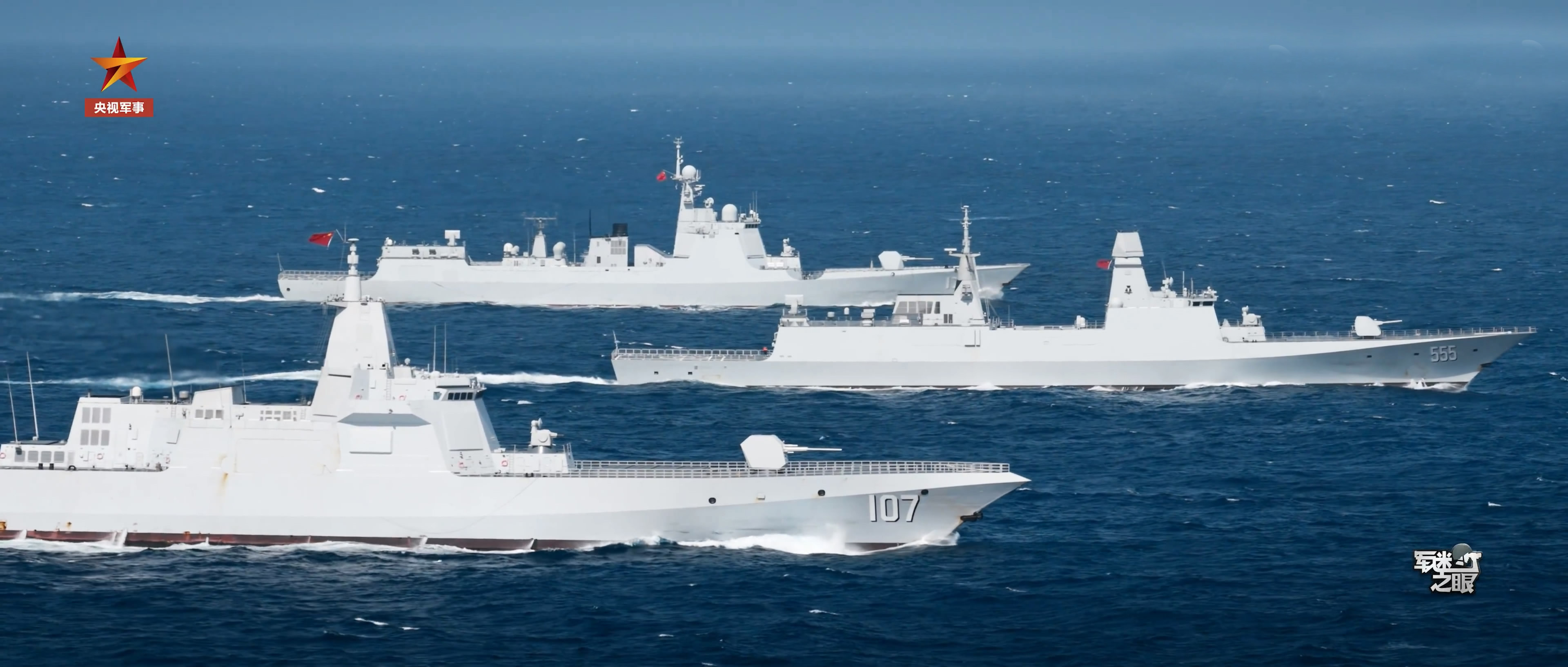 海军最强舰队组合,近期新服役的战舰编队出击,055、052D、054B并排航行。