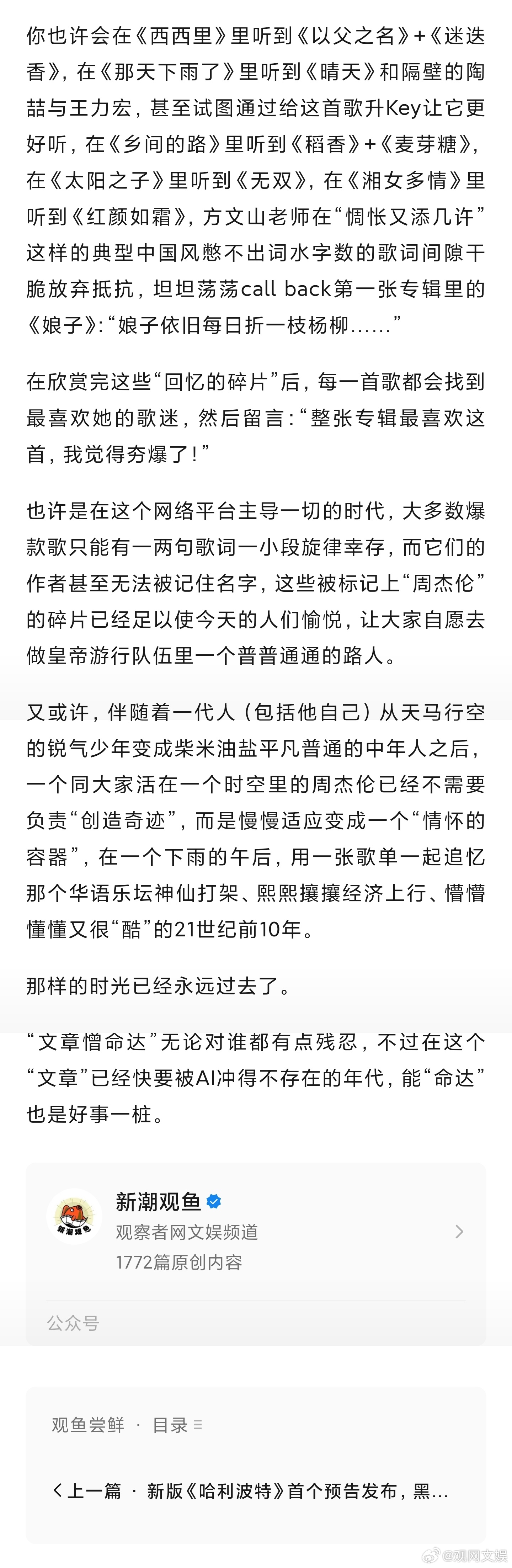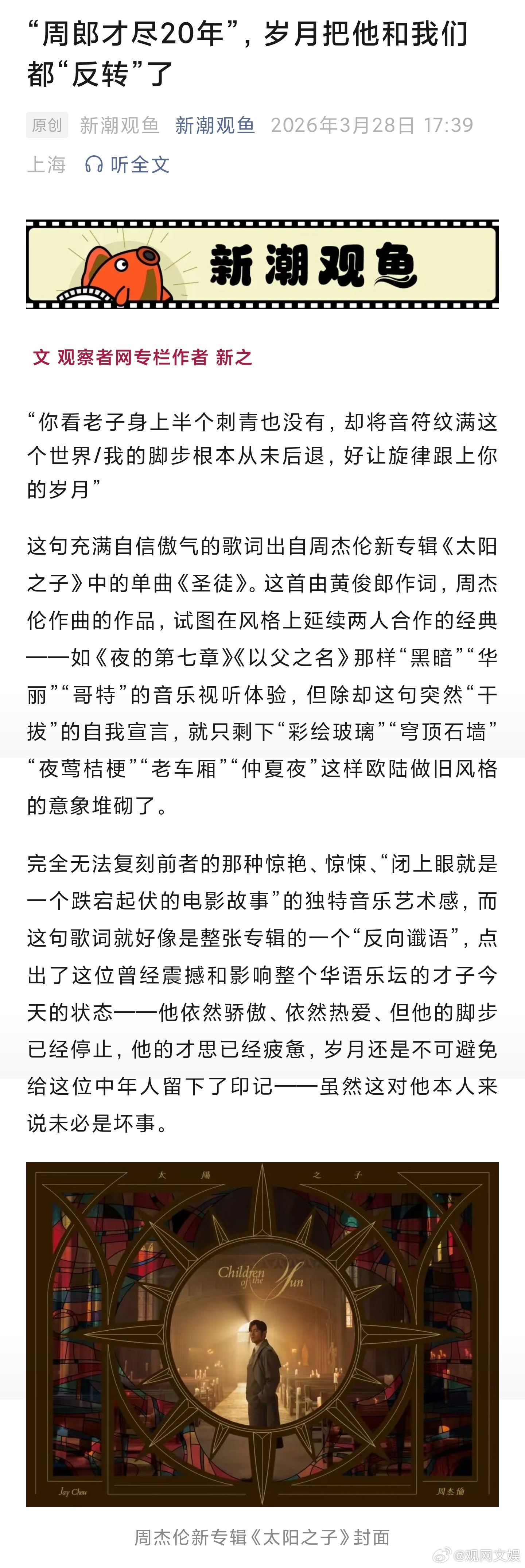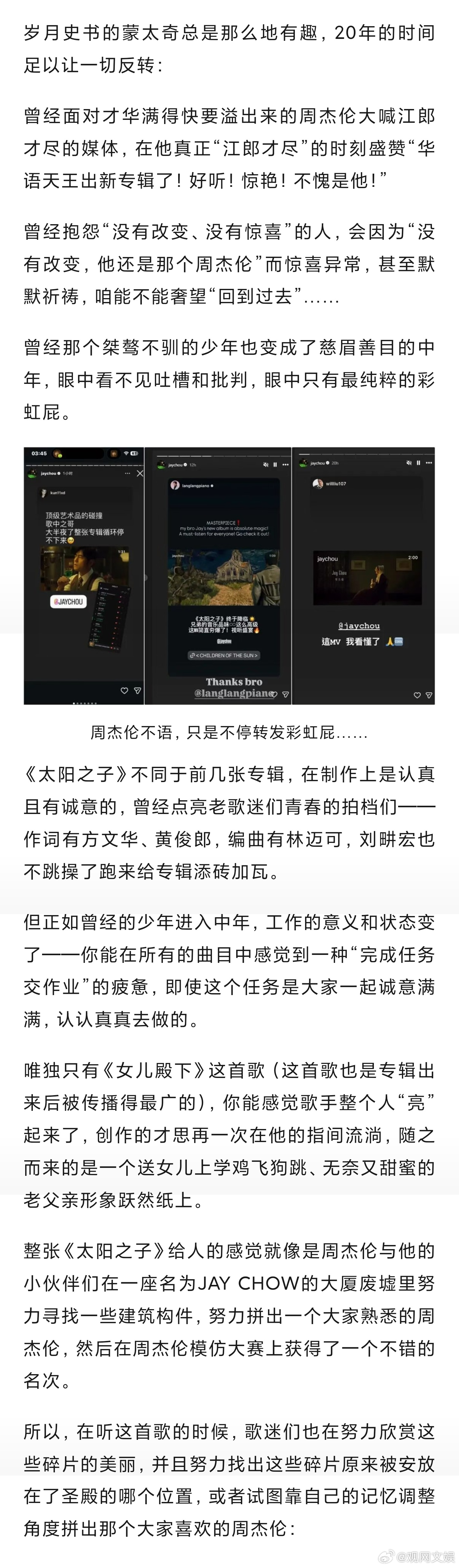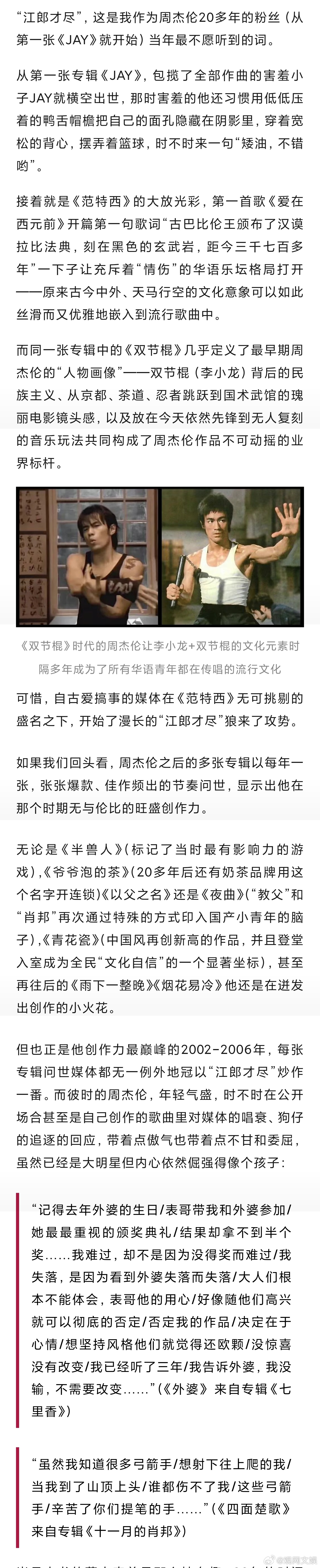 【“周郎才尽20年”,岁月把他和我们都“反转”了】周杰伦已经不需要负责创造奇迹周杰伦的太阳之子在模仿拼凑周杰伦 面对才华满得快要溢出来的周杰伦大喊江郎才尽的媒体,在他真正“江郎才尽”的时刻盛赞“华语天王出新专辑了!好听!惊艳!不愧是他!”曾经抱怨“没有改变、没有惊喜”的人,会因为“没有改变,他还是那个周杰伦”而惊喜异常,甚至默默祈祷,咱能不能奢望“回到过去”……