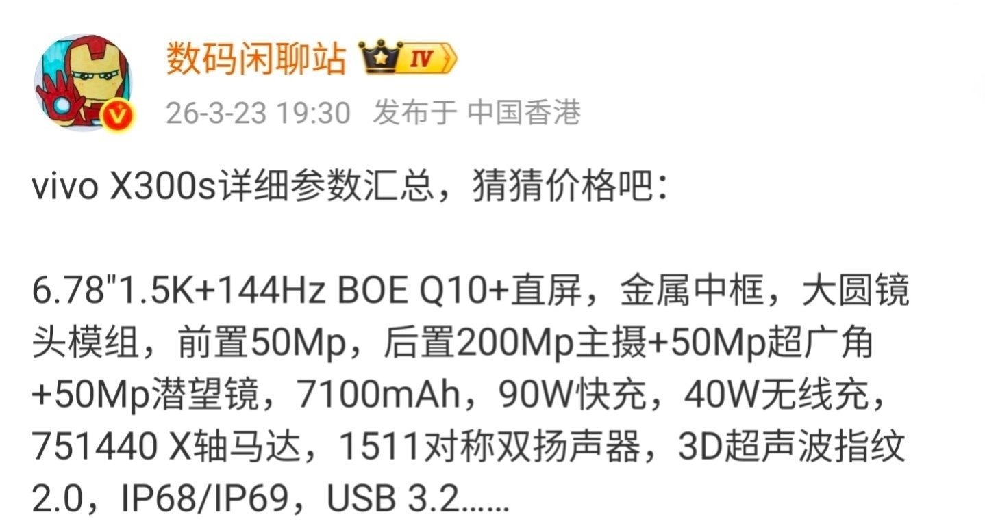 vivo X300s 手机将于 3 月 30 日 19:00 发布,博主 数码闲聊站对这款新机的详细参数进行了汇总。