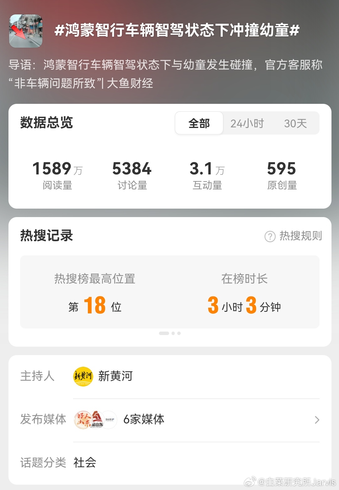 鸿蒙智行车辆智驾状态下冲撞幼童还以为这个事就沉了,然后词条居然一下就上来,点开一看,都是山东媒体啊,有点刚啊这大v聊车