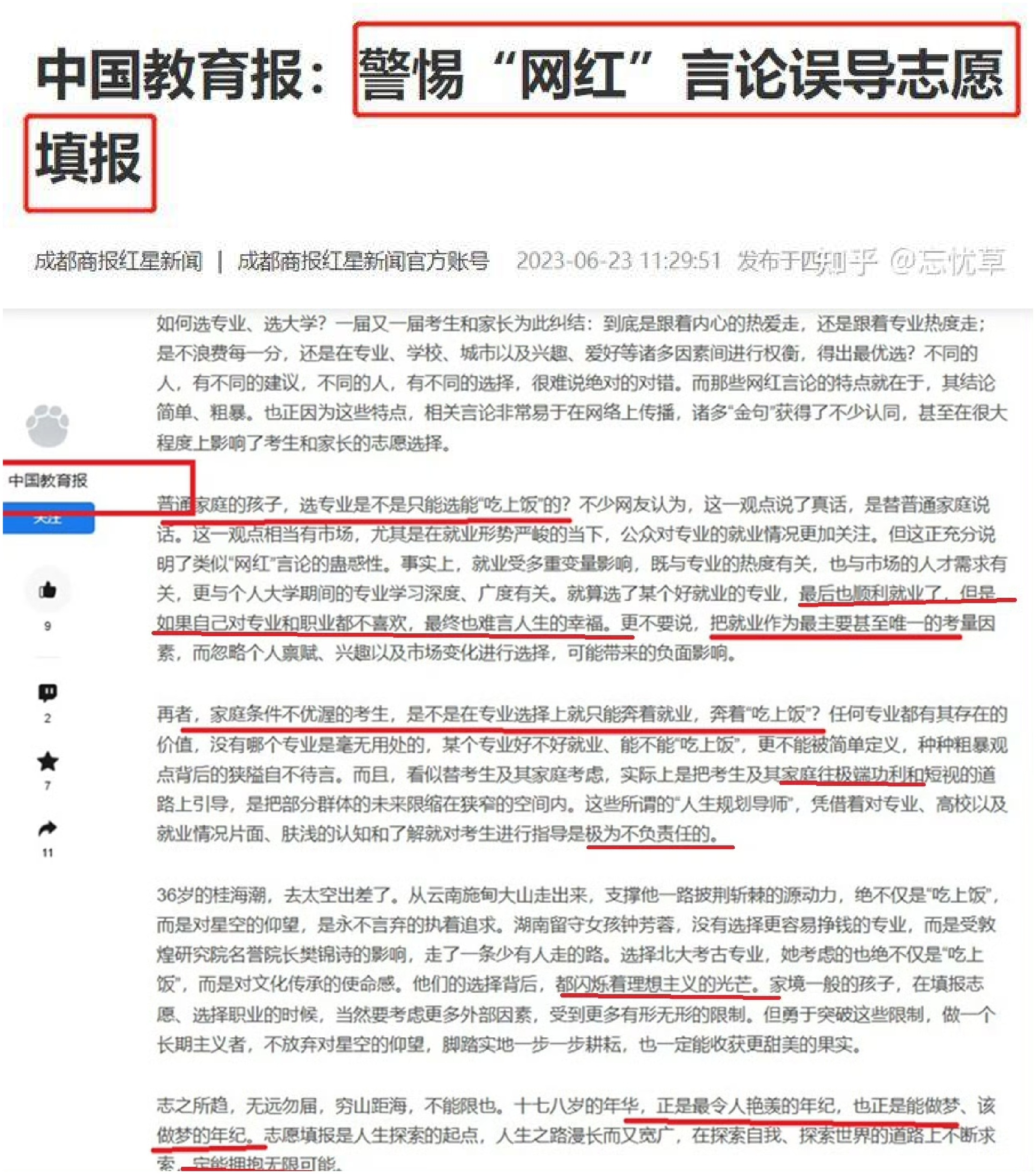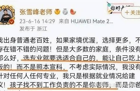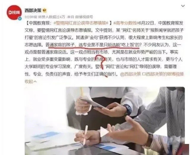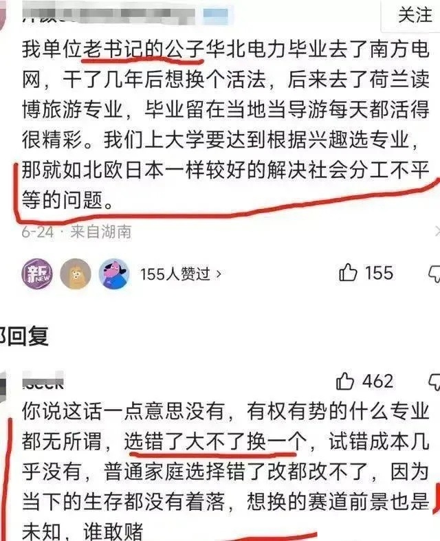 记录者 有些官媒,还是一个个大名鼎鼎的,得有多缺德才劝普通家庭孩子去学吃不上饭的专业,最后去填坑做了耗材?而他们自己的孩子却一个个默默而忠实地进了理想的大学有钱途的专业……人民群众的眼睛是雪亮的,知道谁好。