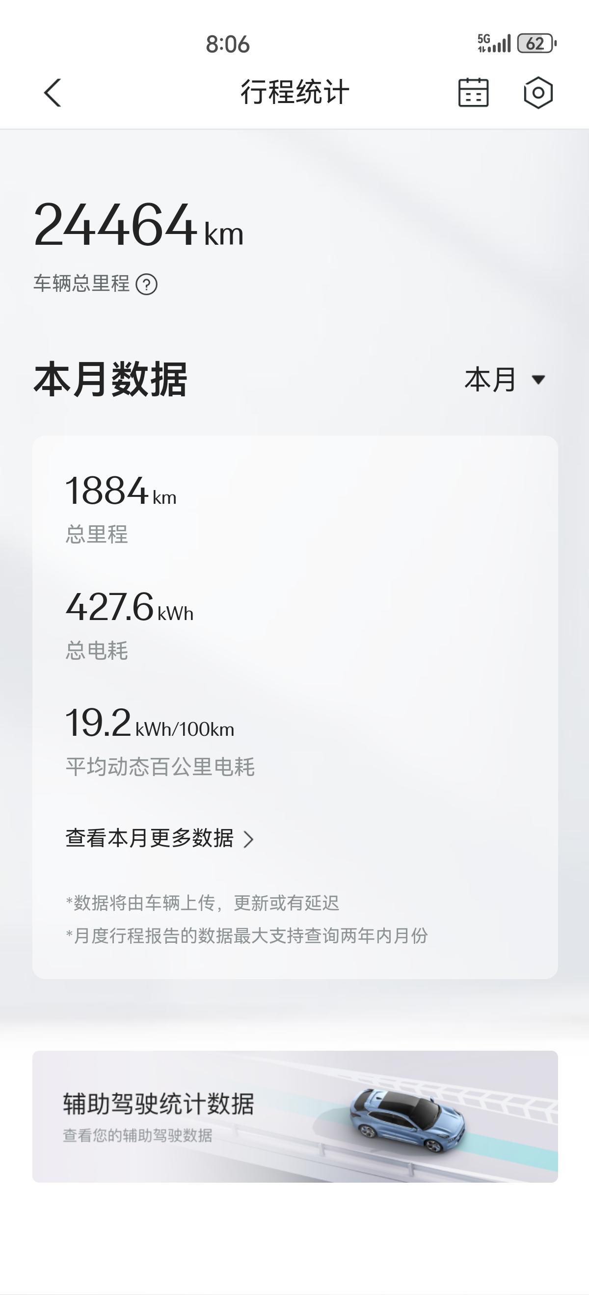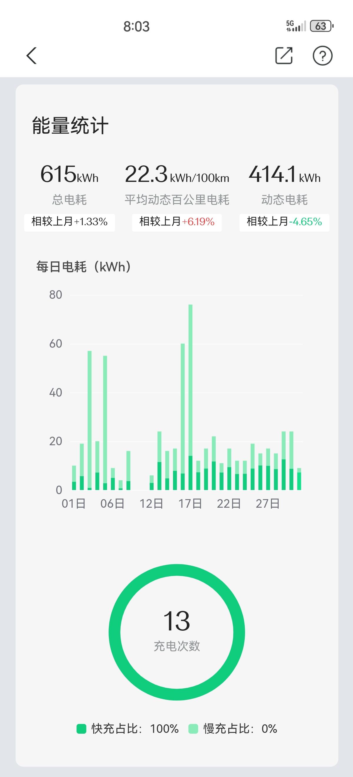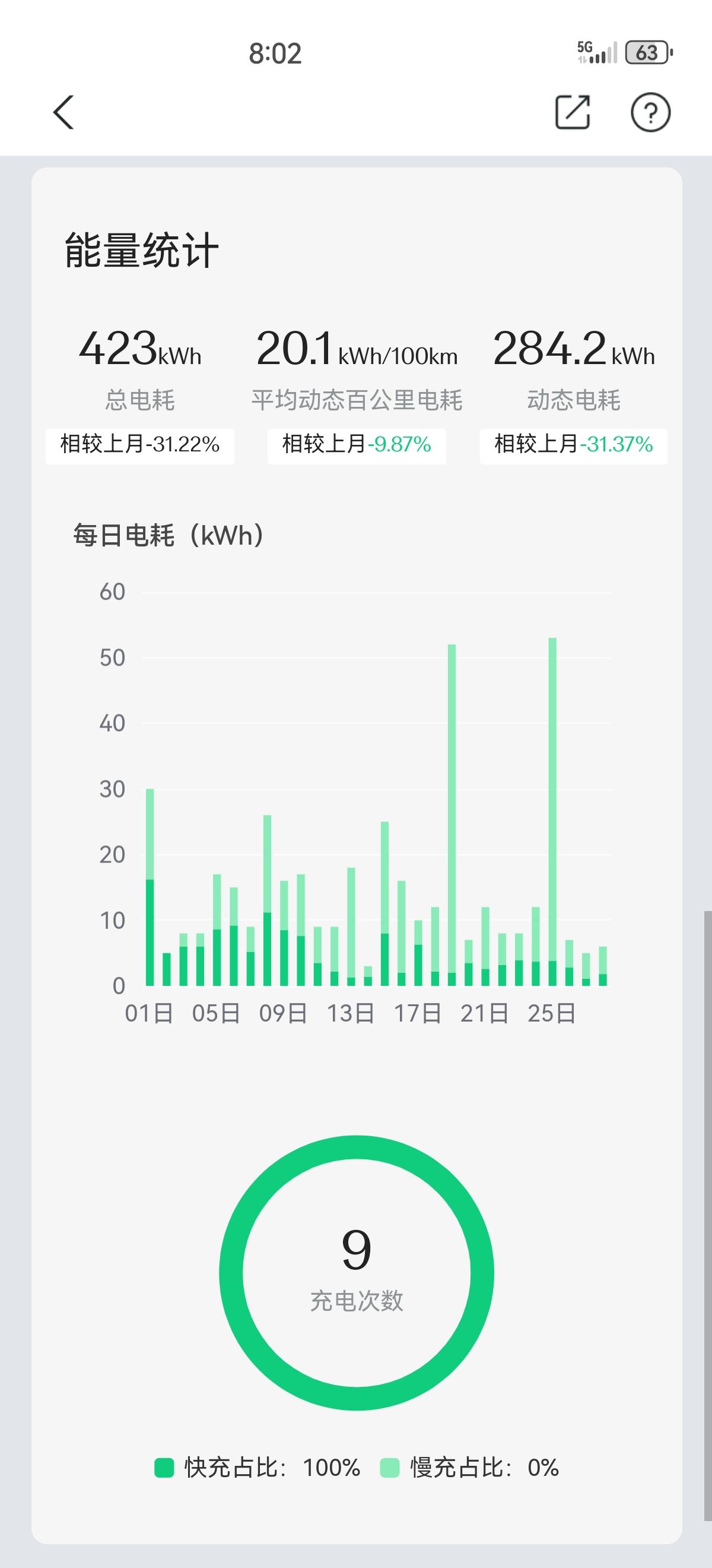 2月份总行程1416公里,在一年中几乎是最少的。总电耗423度,动态能耗284度,有接近140度是静态油耗,包含空调。冬季空调是耗电的大小。对于电池来讲,空调加热比空调制冷更耗电。但最终20.1度的动态平均能耗,个人还是比较满意的。毕竟我的是四驱车型功率大,电耗也大。但随着气温的上涨,3月份即将结束,目前的平均能耗是19.2,又降了接近一度,更加满意了。相反1月份的平均能耗就要高出两度。主要还是因为天气严冷,全天候使用空调,且电池预热也耗电。 二月份充电9次。听起来很多主要是因为本人习惯从40%充到95%,可能有轻度里程焦虑的原因吧。充电基本都是在极氪超充站完成。因为成为了极氪超级会员。充电时省去了服务费,而电费便宜到2毛钱上下一度,十分喜人,所以一个月下来总电费不超200元,每公里1毛左右。【来自懂车帝车友圈】