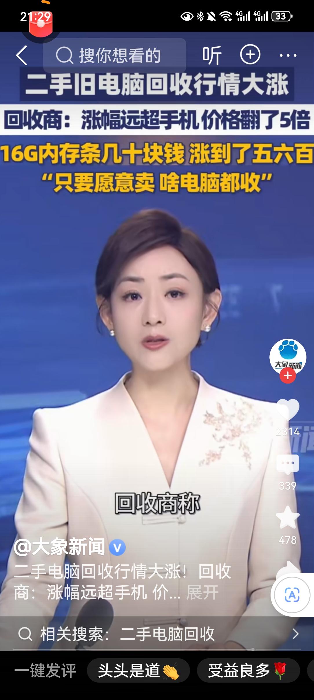 二手电脑回收价暴涨,16G内存翻10倍,啥情况? 最近,河南郑州的二手电脑回收市场彻底火了,行情一路狂飙,涨幅远超手机,成了不少人眼中的“香饽饽”。有回收商直言,现在只要愿意卖,啥电脑都收,这样的行情变化,到底藏着哪些门道? 一、价格疯涨!二手硬件身价翻倍 从具体的涨价数据来看,二手电脑硬件的涨幅堪称“离谱”: 1. 16G内存条:此前仅值几十元,如今直接飙升至五六百元,涨幅接近10倍; 2. 8GB内存条:从原本的15元左右,涨到了80元上下,高频款更是接近百元,涨幅超5倍; 3. 4GB DDR4内存条:2025年7月前还不到10元,现在价格涨到了25-30元,涨幅也达到3倍左右。 这样的价格变动,让不少家里有闲置电脑、内存条的市民直呼“没想到”,原本以为是“废品”的硬件,突然成了能换不少钱的“宝贝”。 二、为啥突然涨价?三大核心原因揭秘 二手电脑回收行情大涨,并非偶然,而是多重因素共同作用的结果: 1. 全球芯片供应链紧张 近年来,全球芯片制造工艺调整、产能转移等问题,导致全新内存、芯片等核心硬件供货不足。新货供应跟不上需求,市场自然将目光转向了二手硬件,间接推高了二手硬件的回收和流通价格。 2. AI产业爆发带动刚需激增 AI技术的快速发展,带动了服务器、高性能PC的需求暴涨。而16G及以上大内存,是AI运算、高性能计算的核心配置,市场对这类硬件的需求急剧增加,供不应求的局面直接拉动了价格上涨。 3. 老机升级与装机潮兴起 不少用户为了应对系统升级、提升办公或游戏体验,纷纷选择收购二手硬件对旧电脑进行升级;同时,低成本装机需求也让二手硬件成为不少人的选择。双重需求叠加,进一步刺激了二手电脑硬件的回收价格。 三、普通人该咋应对?实用建议来了 面对火爆的二手电脑回收市场,不同需求的人群可以参考这些建议: 1. 有闲置硬件的市民 可以趁当前行情好,对比多家回收商的报价后,择机出售变现。不过要注意,部分回收商可能存在压价行为,提前了解市场行情,避免吃亏。 2. 计划装机或升级电脑的用户 目前二手硬件价格处于高位,若非刚需,可暂缓采购计划。等待芯片供应链恢复、新货供应充足后,价格大概率会出现回落,届时采购会更划算。 3. 想入行二手回收的人群 当前市场热度较高,但需注意把控货源和风险。二手硬件的品质参差不齐,回收时要做好检测,避免购入故障硬件造成损失。 二手硬件价格暴涨,既是市场供需变化的体现,也是科技产业发展的缩影。 对于普通人来说,抓住行情红利的同时,也需理性看待市场波动。 你家里有闲置的电脑或内存条吗?打算趁着涨价出手,还是留着自用?欢迎在评论区留言聊聊你的看法!