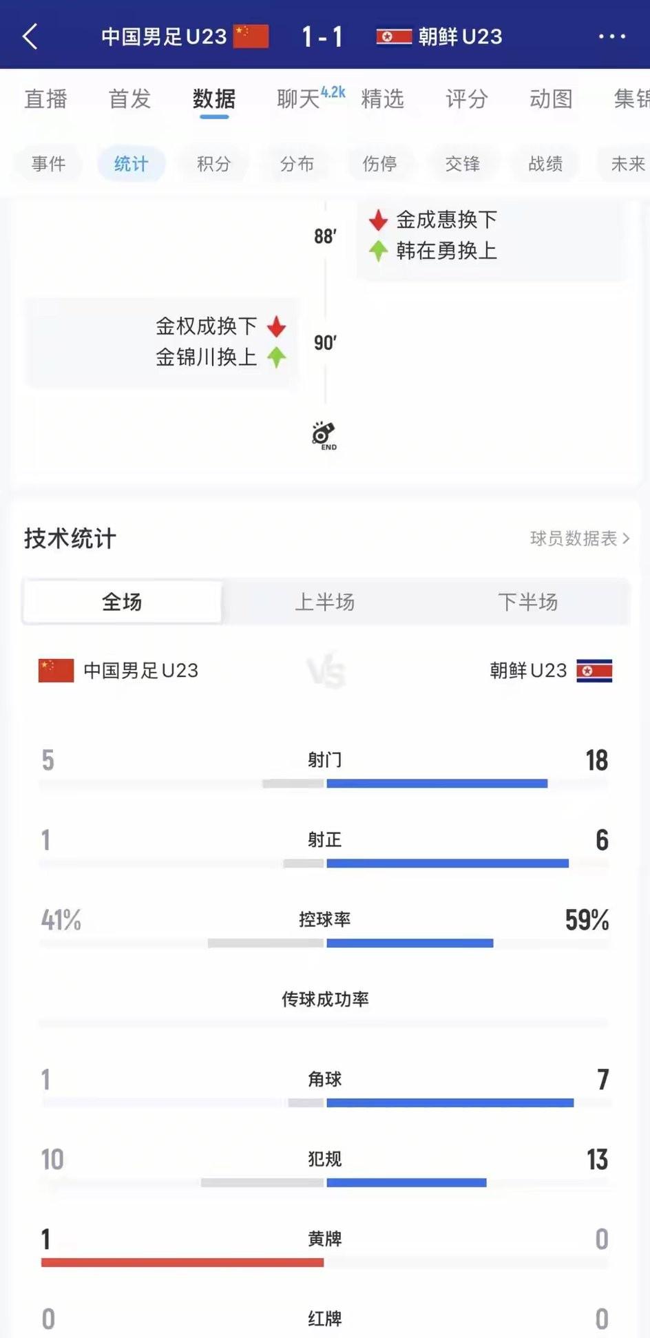 依靠李新翔制造、向余望罚进的有点勉强的点球,u23国足勉强地以1:1逼平了朝鲜队。两战难求一胜的中国队,居然依靠进球数占优,勉强地暂列西安青年足球邀请赛第二位,但还有争冠军的机会。 之所以有这么多“勉强”之词,是这场比赛基本被朝鲜队压制,控球与传球、射门与射正等数据,都是朝鲜队占优。看场面,u23国足再没亚洲杯时的强度、硬度、速度和运气,在逼抢凶狠的朝鲜队面前很难受,好在通过顽强拼搏把比分扳成平局,还是令人惊喜。 接下来还要对阵越南队,希望小伙子们再拼一回。[点亮平安灯]