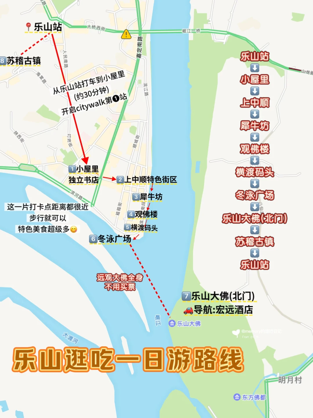 乐山站➟小屋里➟上中顺➟犀牛坊➟观佛楼➟横渡码头➟冬泳广场➟乐山大佛➟苏稽古镇