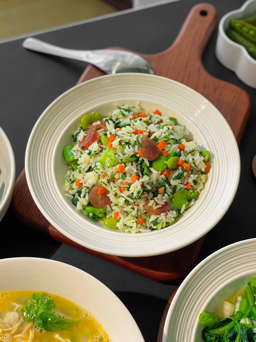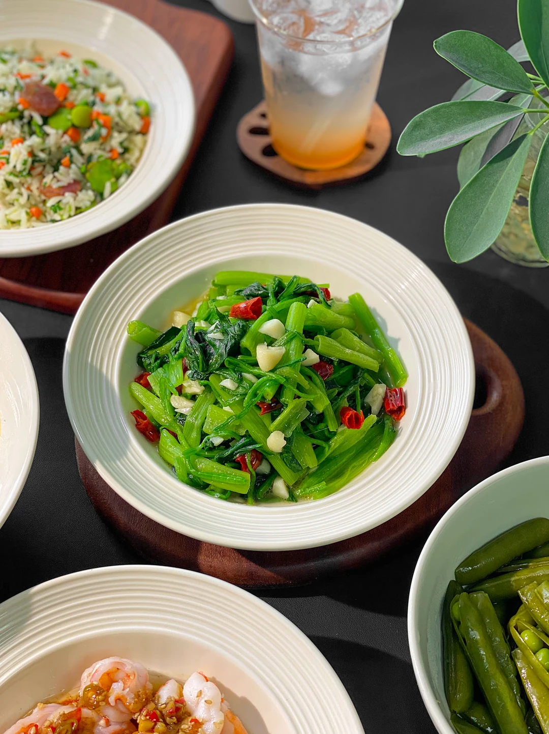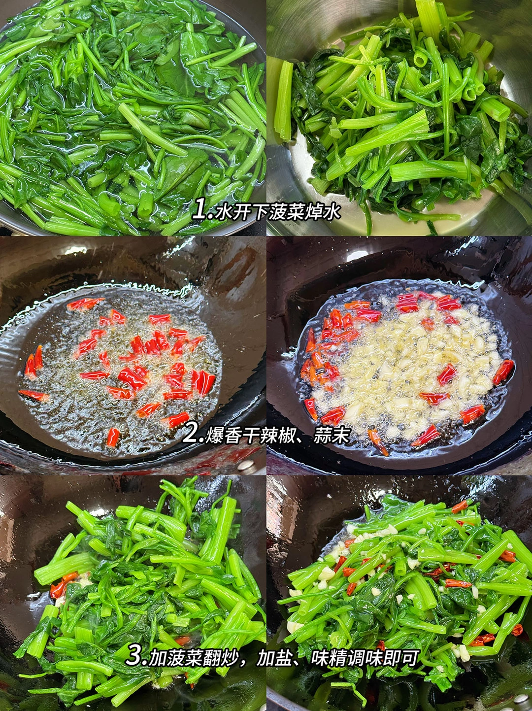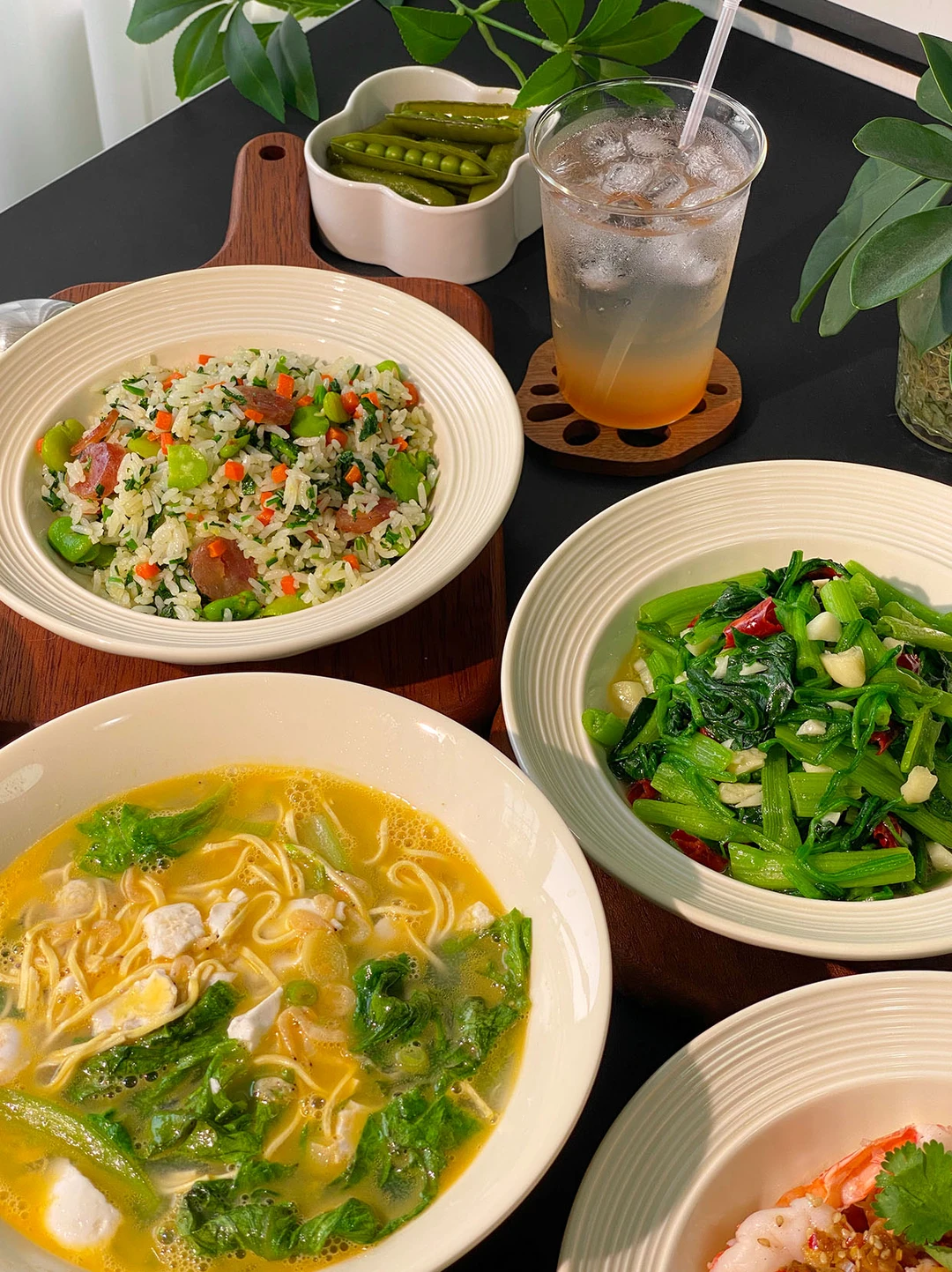 今日菜单🥣: 1️⃣椒麻虾球 2️⃣干丝汤 3️⃣荠菜炒饭 4️⃣清炒菠菜 5️⃣荠菜炒饭