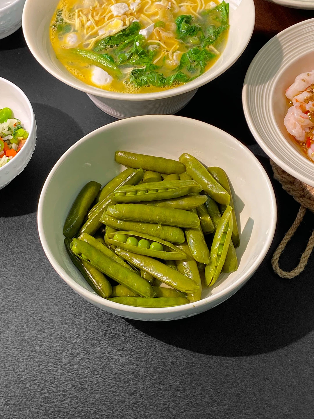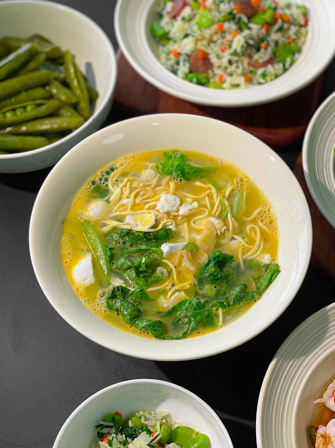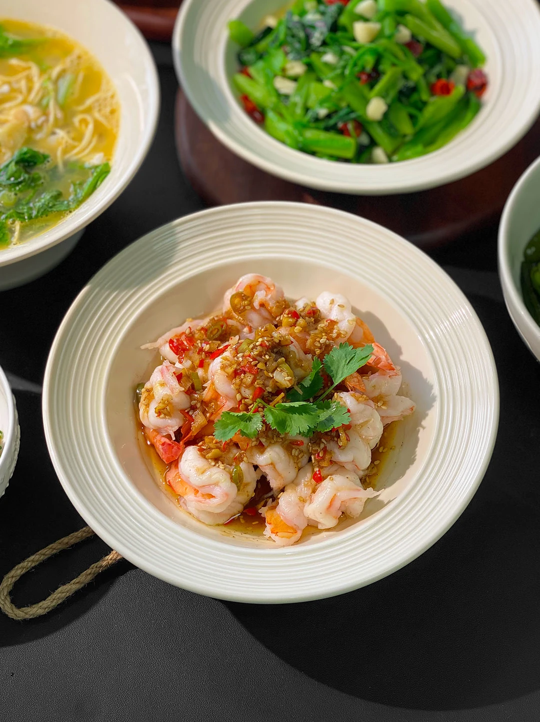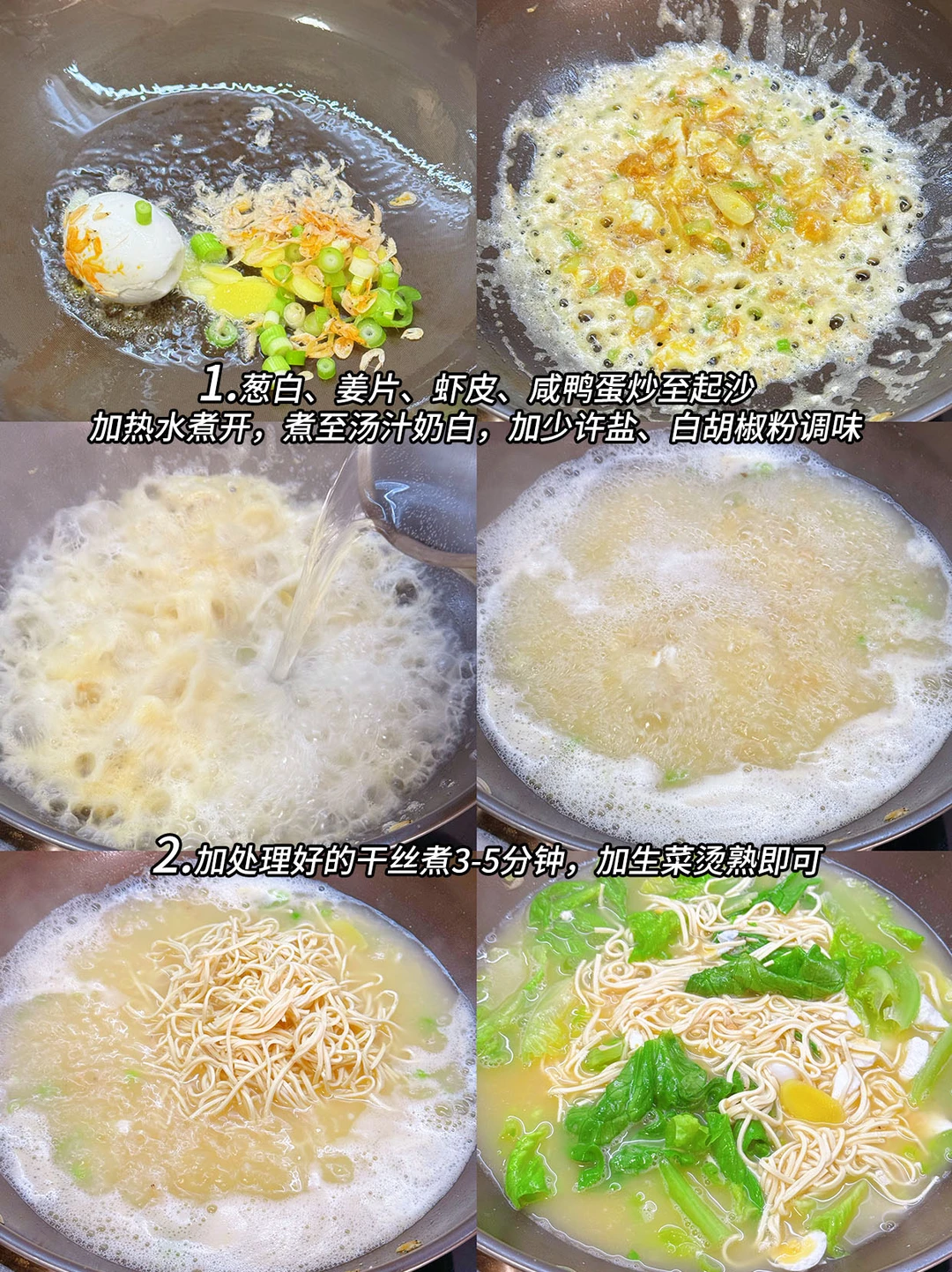 今日菜单🥣: 1️⃣椒麻虾球 2️⃣干丝汤 3️⃣荠菜炒饭 4️⃣清炒菠菜 5️⃣荠菜炒饭