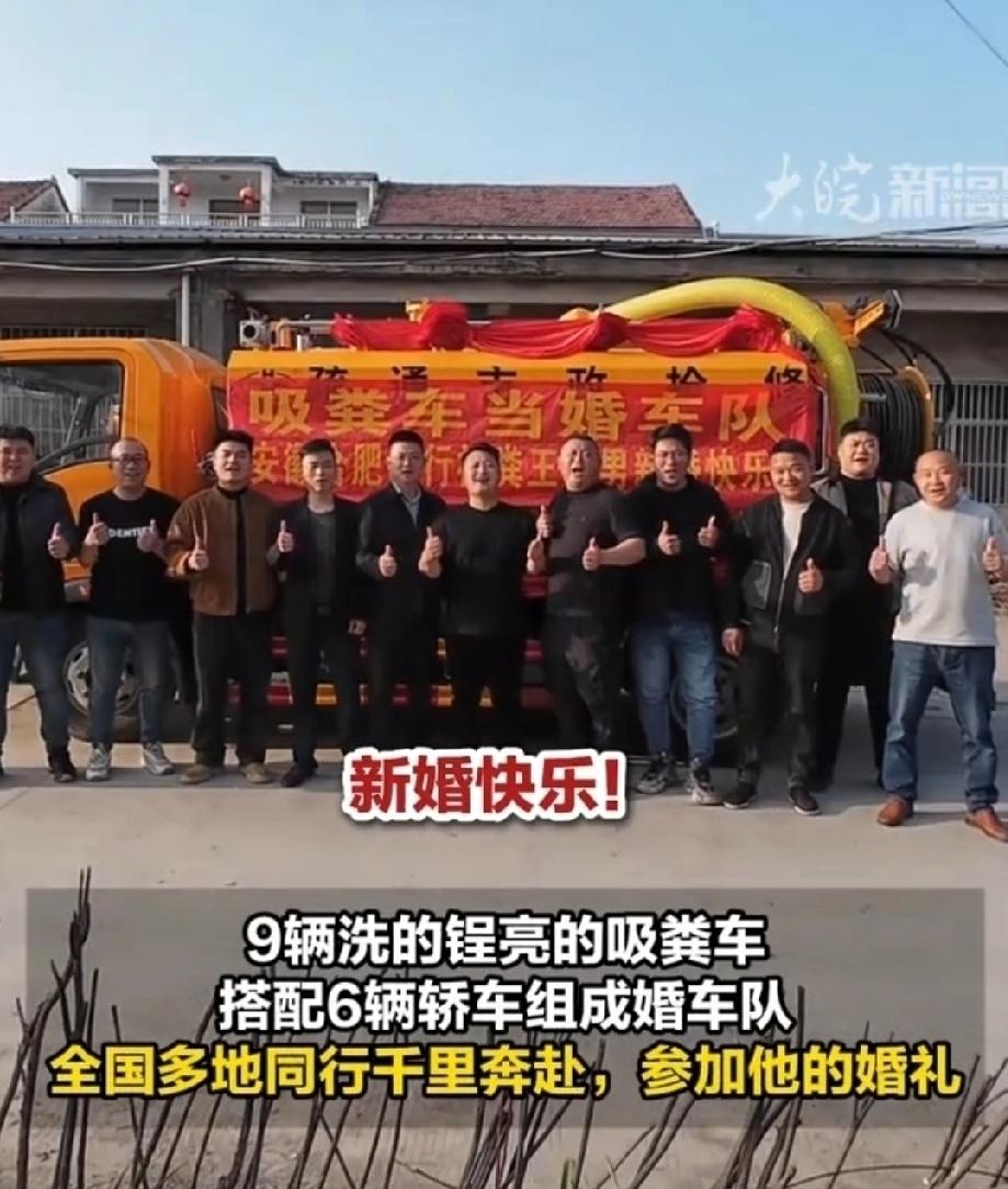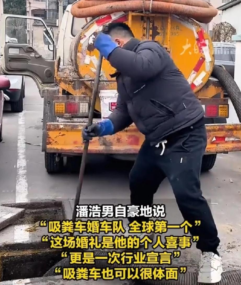 3月28日,是安徽淮北市95后小伙潘先生大喜的日子。他的迎娶新娘的婚车独具一格,由9辆吸粪车和6辆轿车组成。吸粪车打扮的焕然一新,车头挂着喜字和大红花。车身上的“吸粪车当婚车”横幅格外引人注目。潘先生自豪的说“吸粪车婚车队,全球第一人”。 潘先生大学专业是影视编导专业,毕业后“子承父业”,成为“粪二代”。父亲早年从事掏粪工作,成立了自己的公司。如今有两辆车,6个工人。每辆车年收入40万。潘先生上班开吸粪车,下班开奔驰。 潘先生认为自己干最脏的活,挣干净的钱,体现了劳动的价值和年轻人的勇气。他想用吸粪车组成婚车队,得到了女友李女士的支持。 潘先生自己的吸粪车不够,发布视频借用。得到了各地的同行的响应,主动和他联系。于是在他的婚礼上,来自安徽、湖北、山东等地的同行,开着吸粪车前来祝贺。 潘先生用吸粪车作婚车,得到了同行的支持,大张旗鼓的向人们宣告。打破了人们对职业的歧视,展示了劳动者的自信。劳动最光荣。 95后小伙吸粪车做婚车迎娶新娘婚车