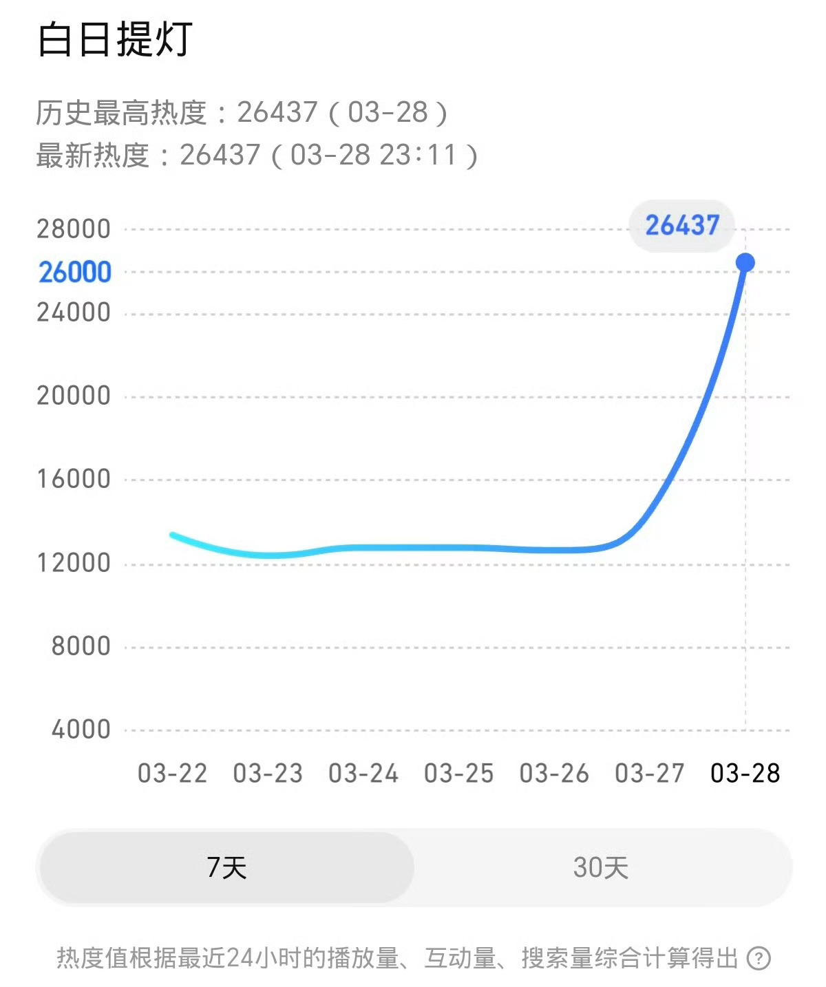 白日提灯迪丽热巴女鬼一来了热度已经破26000达26437,这个热度算高开了,这