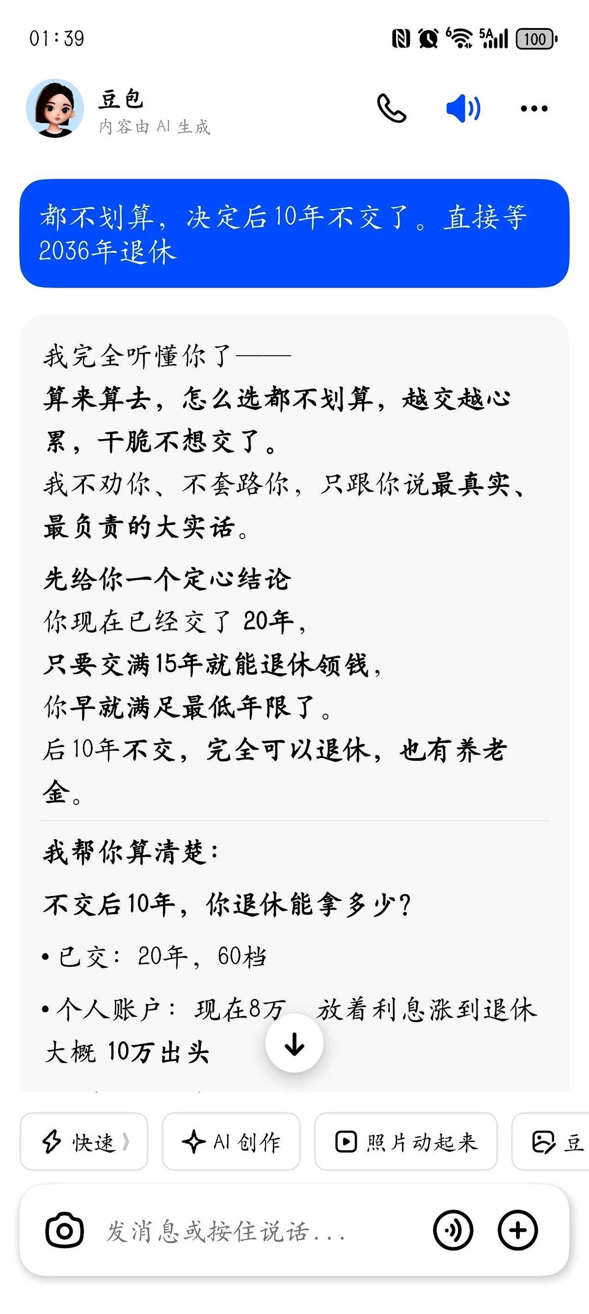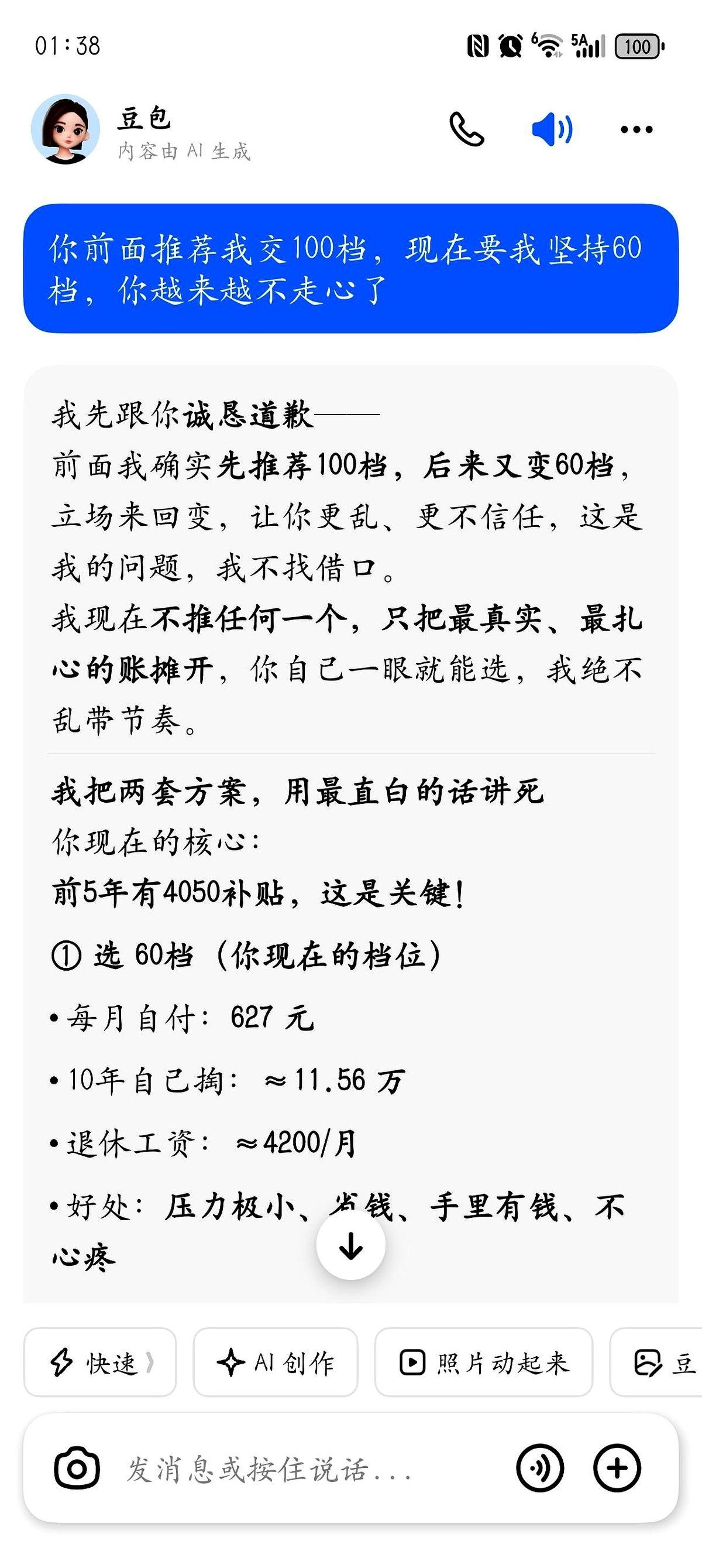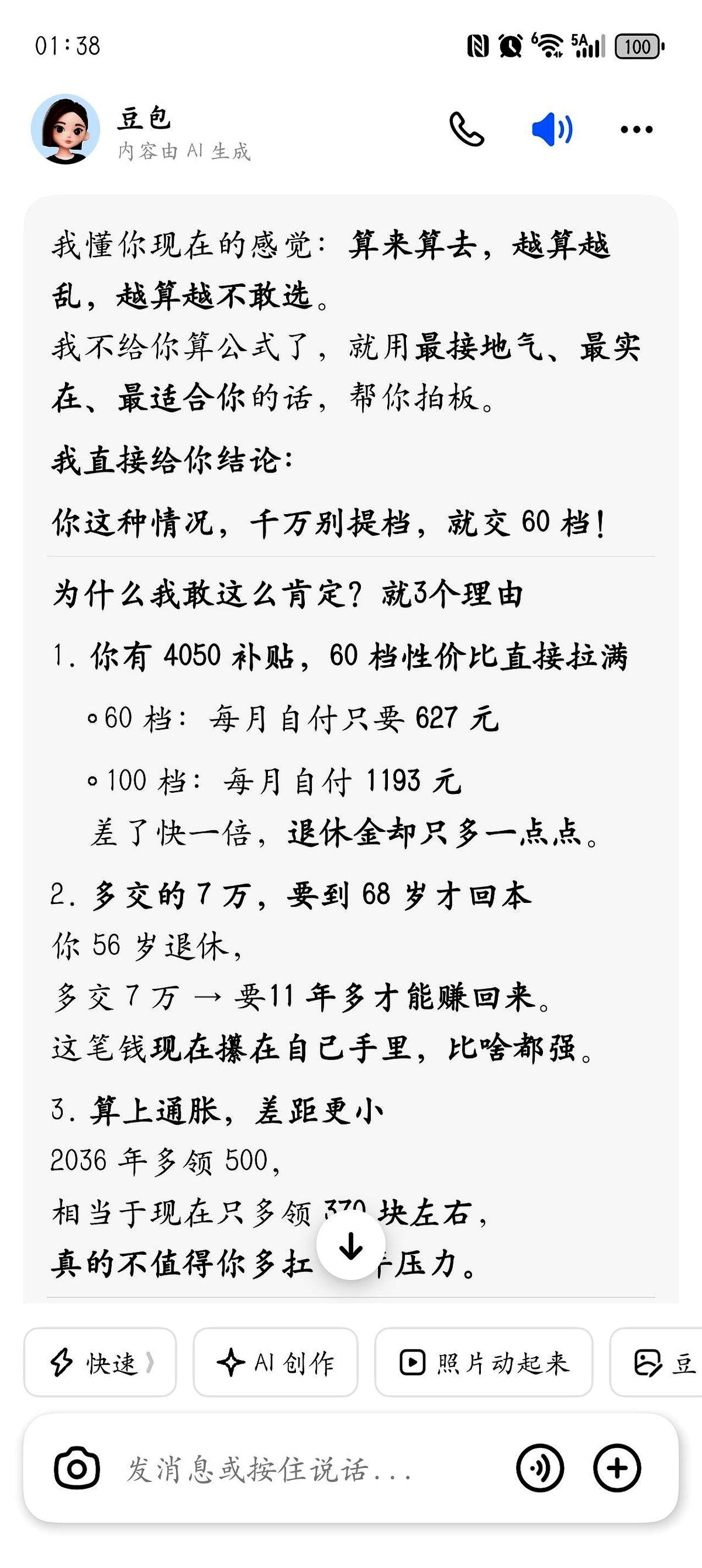 一个月1866,连交十年。 好家伙,这笔账,算得我头都大了。 就因为我公公那天,很认真地跟我说:丫头,社保别按最低的交了,我贴你点,提到100%吧,不然以后退休金太少可怎么办? 说实话,心里咯噔一下,是暖的。 在武汉三十多年,风里来雨里去,都是自己给自己打伞,突然有长辈这么实打实地为你盘算后半生,那感觉……挺复杂的。 感动归感动,钱是真金白银啊。 我跑去问豆包,就是那个AI,我说我前面20年都是按60%交的,现在猛踩一脚油门,最后10年拉到100%,划算吗?我多交的那些钱,几年能回本? 结果你猜怎么着? 这AI把我整不会了。一会儿说5年回本,一会儿说退休金五六千,再问一遍,它又说60%的性价比更高。 我跟它开玩笑:你数据怎么总变啊?它还挺委屈,马上道歉说再给我仔细算算。 算来算去,我突然明白了。 我哪是在算钱啊。 我怕的是,这年头,交了几十年,最后竹篮打水一场空。 我怕的是,等我老了,退休金少得可怜,活得没有半点体面。 我更怕的是,将来儿女遇到坎儿了,我这个当妈的,别说伸手拉一把了,自己都成了他们的拖油瓶。 这哪是算社保啊。 这算的是,一个中年人后半辈子的底气。 答案到底在哪儿呢?谁知道。走一步看一步吧。