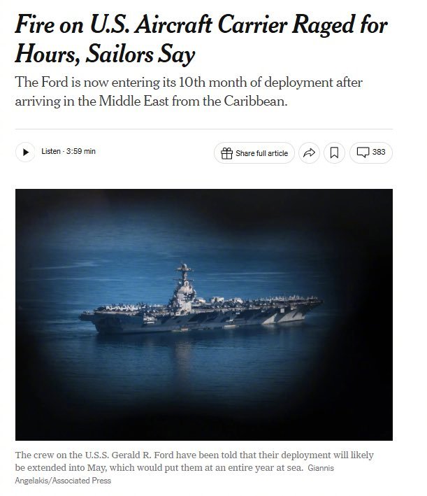 ……再补充原新闻,来自《纽约时报》,曾被特朗普疯狂咒骂的为“假新闻”:美国的“杰拉尔德-R-福特”号航空母舰上的一场大火燃烧了30多个小时,造成600多名水兵无处住宿,至少两人受伤。