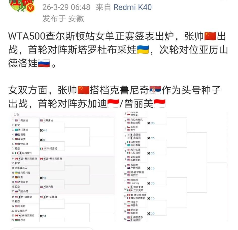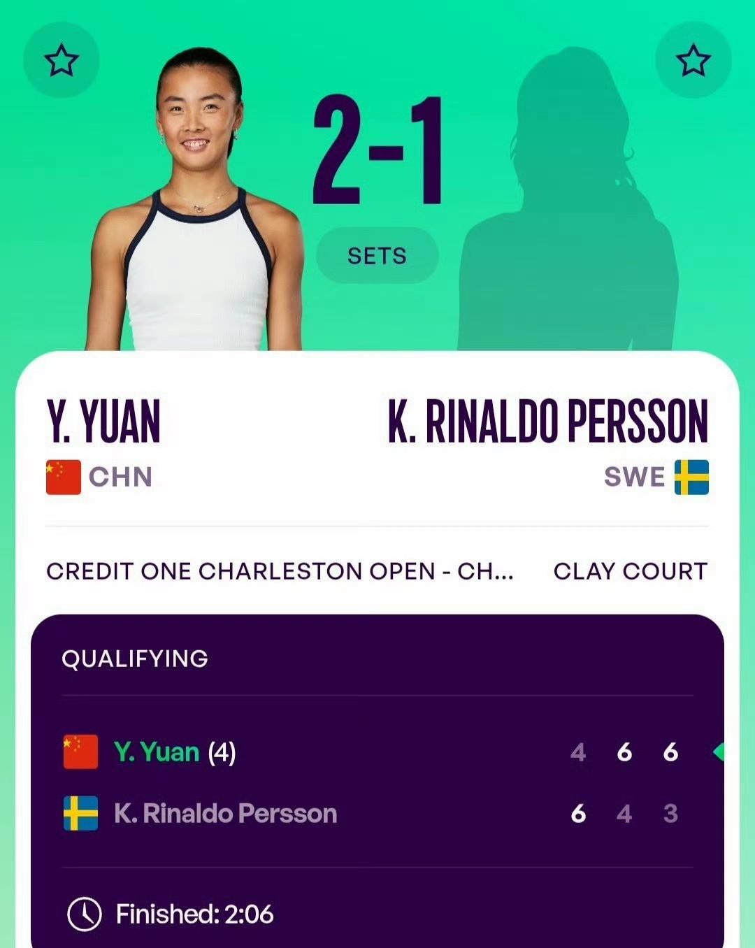 有惊无险,袁悦的状态真的让人感动不已!帅姐和袁悦果然都是劳模。 WTA500查尔斯顿女单资格赛首轮,袁悦4-6/6-4/6-3逆转佩尔松晋级决胜轮。 袁悦收获13个积分、8815美元,即时排名No.121。 张帅入选本站女单正赛,然后搭档克鲁尼奇打双打。帅姐就不怕累吗?