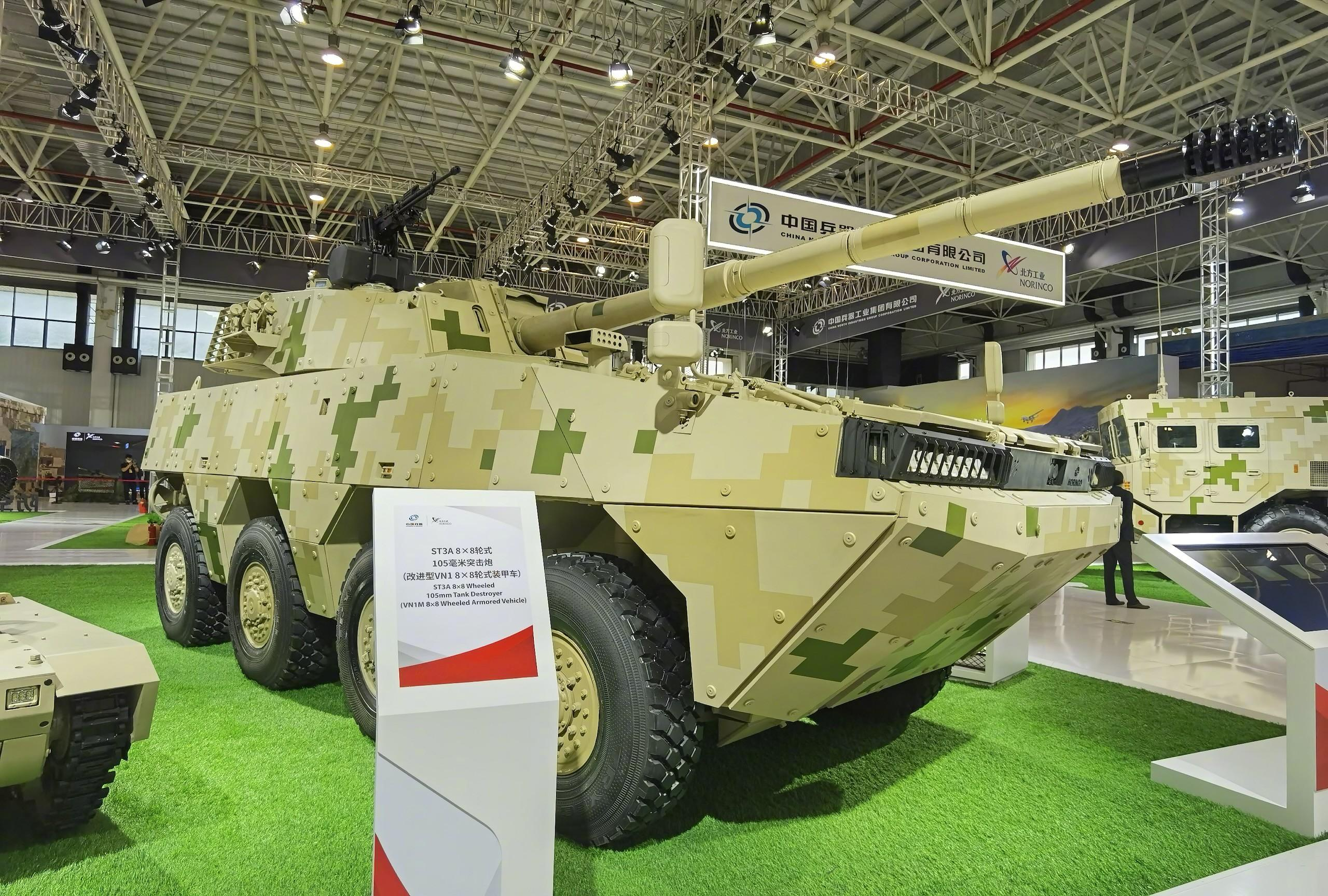 去年在秘鲁举行的2025国际国防和防灾技术展览会(SITDEX)上,中国北方工业公司(NORINCO)展出了一种非常特别的外贸轮式突击炮型号,即在新型VN23八轮装甲车底盘上,安装有ST3双人炮塔的105轮突型(图1-图8)。