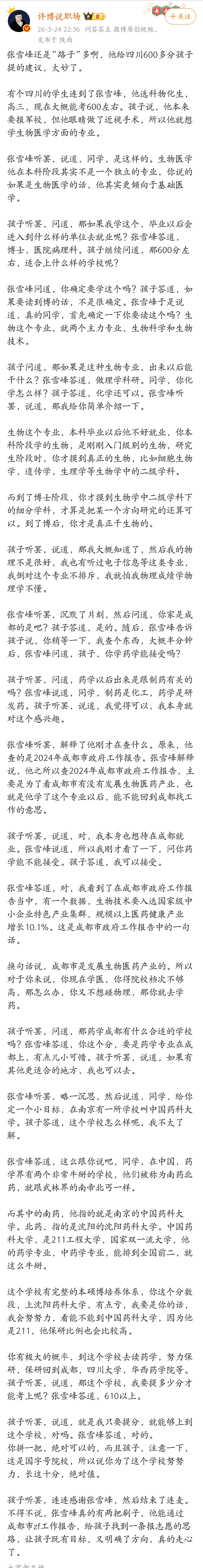 水静流深 4 2026-03-29 23:11 我一直想不明白,一个能考600多分的人,不能通过网络和社会现状以及家长的建议,找到一条以后大概要走的路 遛遛 回复 03-30 01:14 他这个要预判的是几年后的就业形势,他下面线上很多研究员分析的,线下要接触很多院校领导,多数据变量波动就大,没两把刷子瞎说是毁人一生的。 思善行 回复 03-29 23:24 你能这么说,说明你没读过大学,很无知。张雪峰说白了就是很了解全国的院校,专业,毕业去向,录取线,以及政策等等,然后对应去匹配每个人的情况推荐,你以为呢,有几个人了解这些,还这么全的?