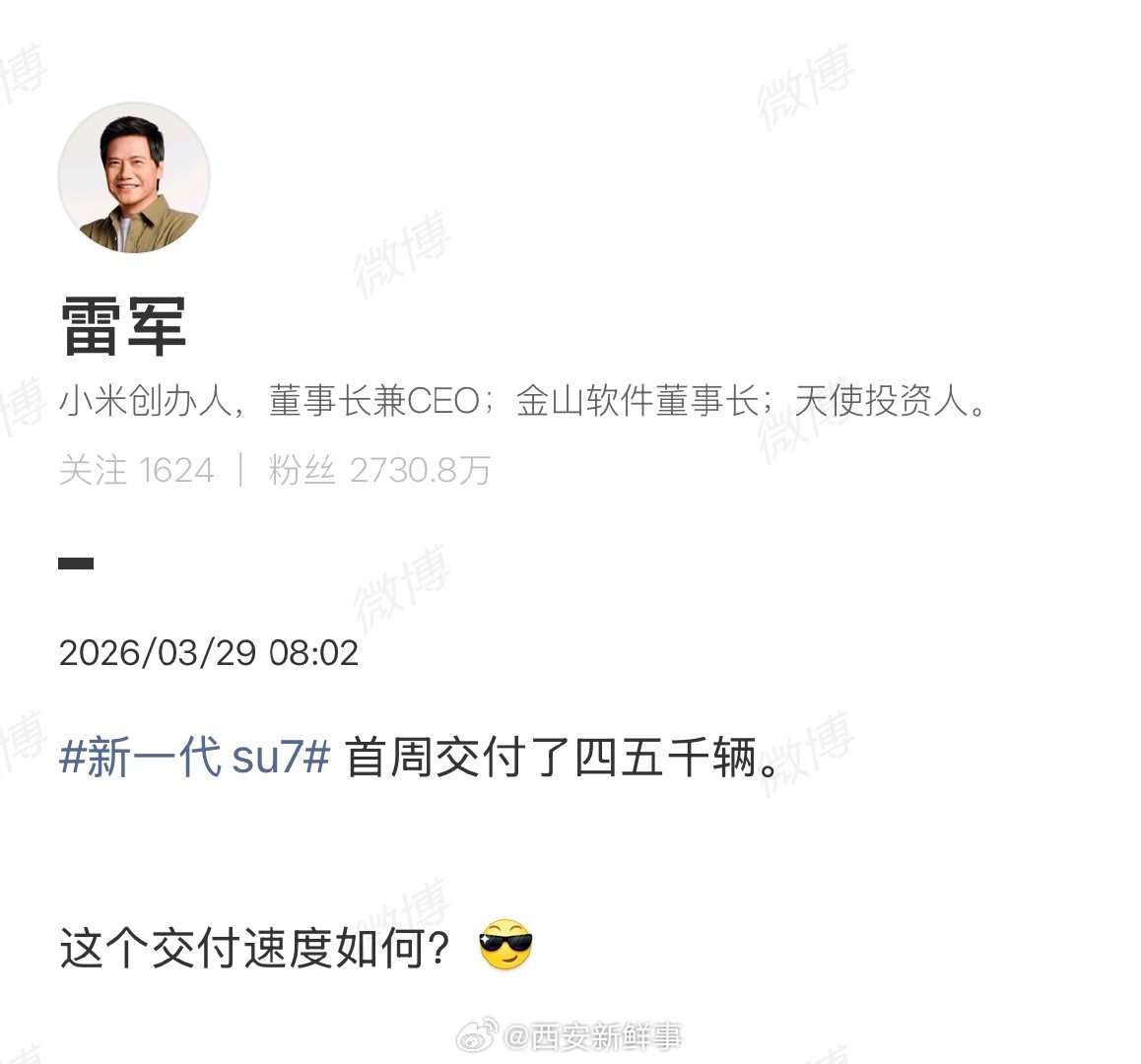 【新SU7交付首周:雷军称今晚才知道首周交付能否过5千】3月29日,发文称新su7首周交付了四五千辆,并问大家“这个交付速度如何”。
