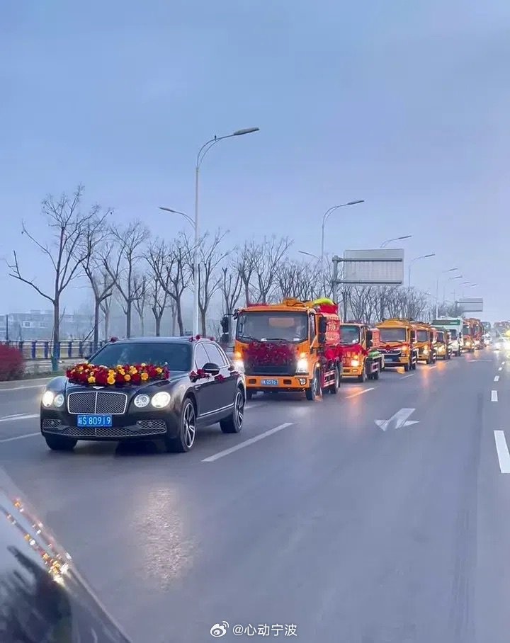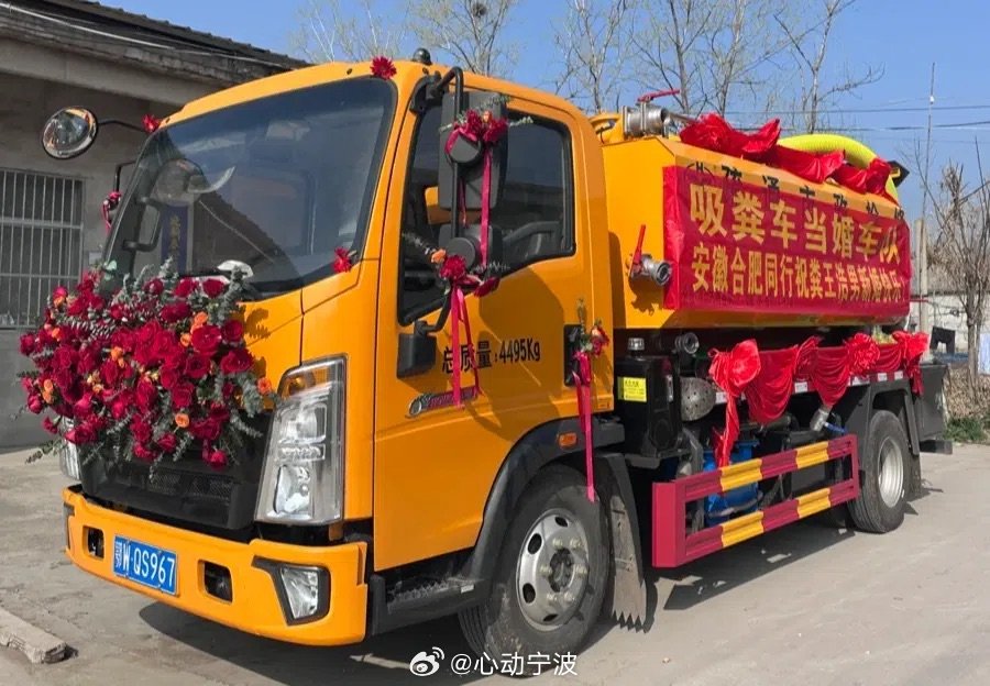 吸粪车婚车队全球第一个 3月28日,宁波慈溪95后小伙潘浩男结婚,用9辆吸粪车加6辆轿车组成独特婚车队,十分吸睛。潘浩男本科毕业后,接手父亲从事20多年的粪便清运工作,不怕脏累,以本职为荣。他工作时开吸粪车,下班后开奔驰,踏实生活。家人最初反对,最终被他说服,新娘也支持他的职业与创意婚车想法。他认为这份工作虽辛苦,但收入干净稳定。这场特别的婚礼彰显了劳动者的自信与担当,传递出平凡岗位亦光荣的正能量。(宁聚)暖心浙江暖心中国