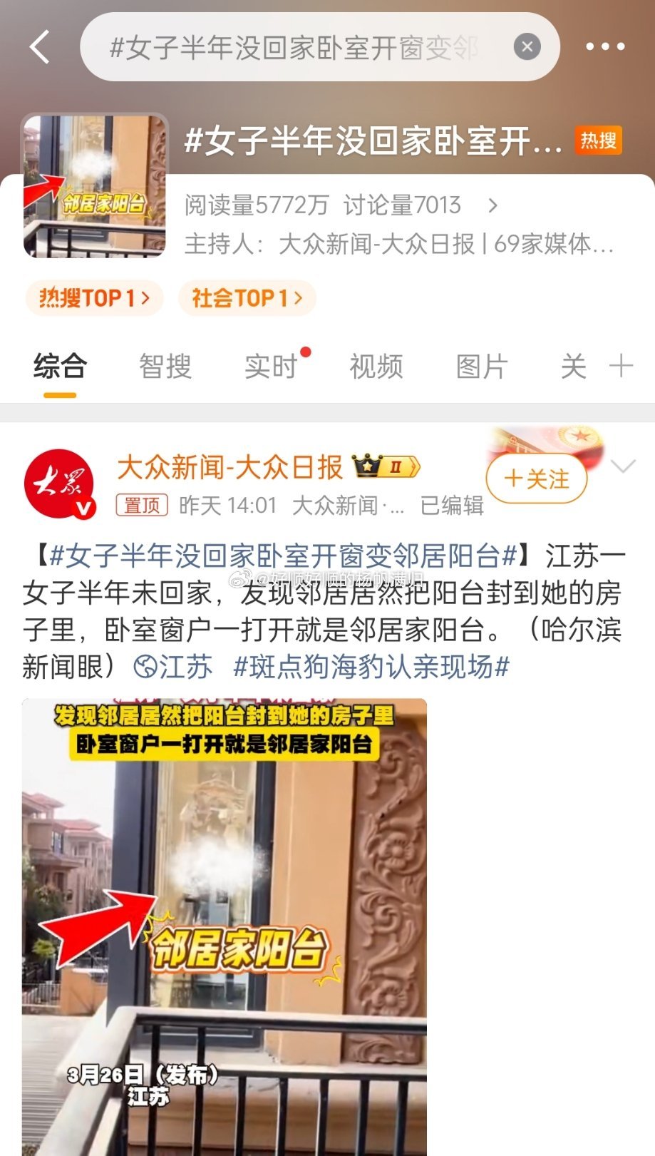 女子半年没回家卧室开窗变邻居阳台