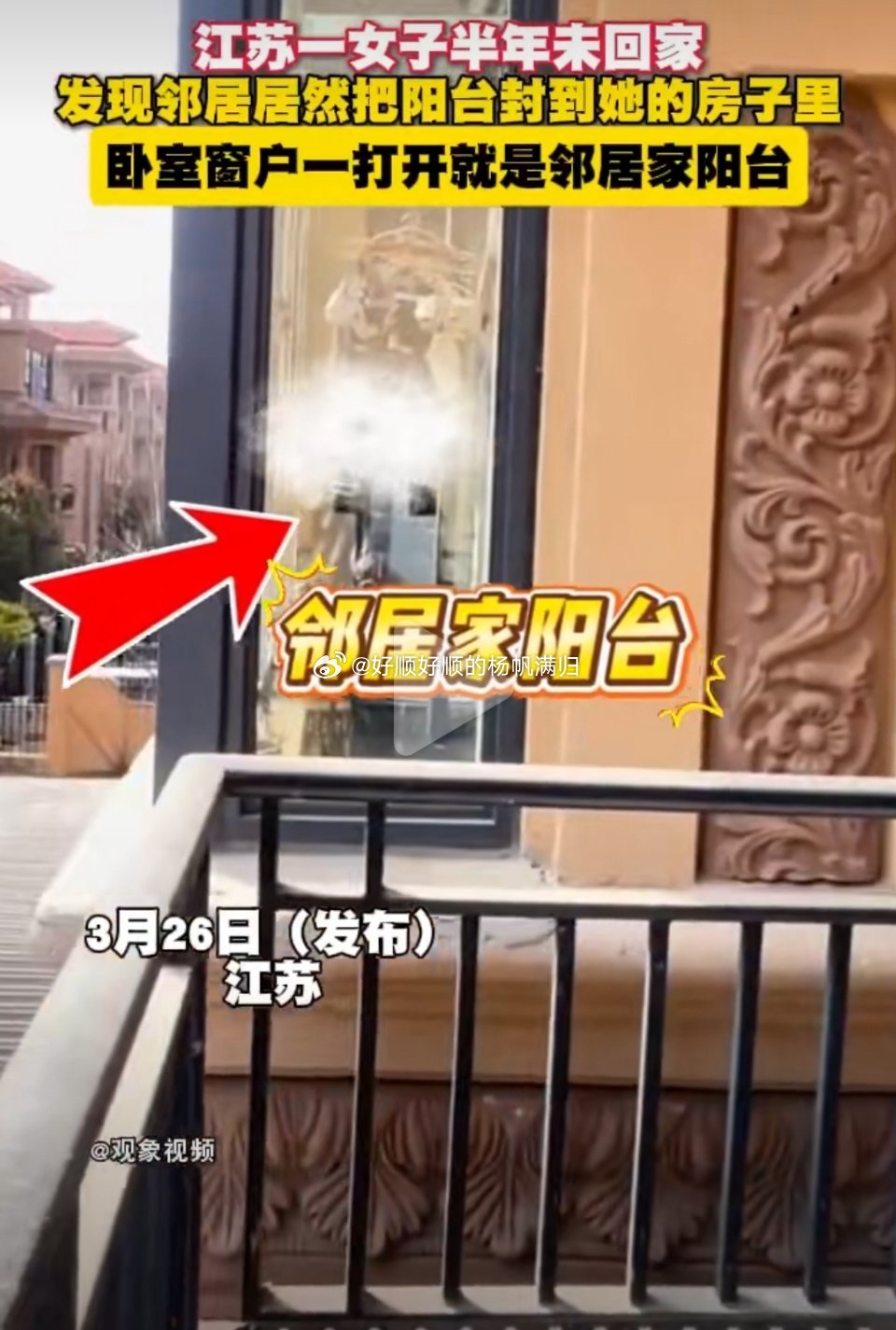 女子半年没回家卧室开窗变邻居阳台严重怀疑这不是实地,这块应该中空的那种联排三四层