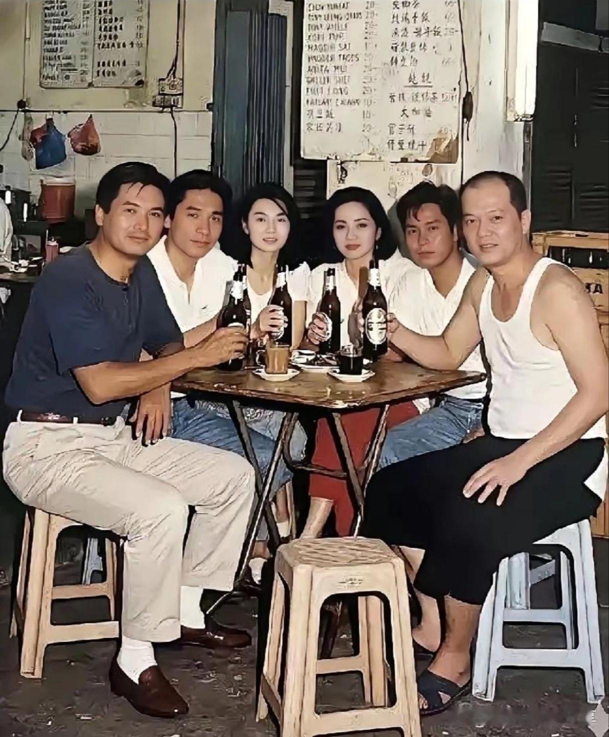 这张照片里除了周润发,还能认出几位熟悉的面孔。左二穿白衬衫的是梁朝伟,中间两位女星分别是张曼玉和梅艳芳。右边三位男士,从右往左数,穿背心的是吴宇森(导演),他左边是李修贤,再左边是刘德华。他们围坐在大排档小桌旁,举杯畅饮,背景是手写的菜单,充满老香港的市井气息,氛围轻松又怀旧。