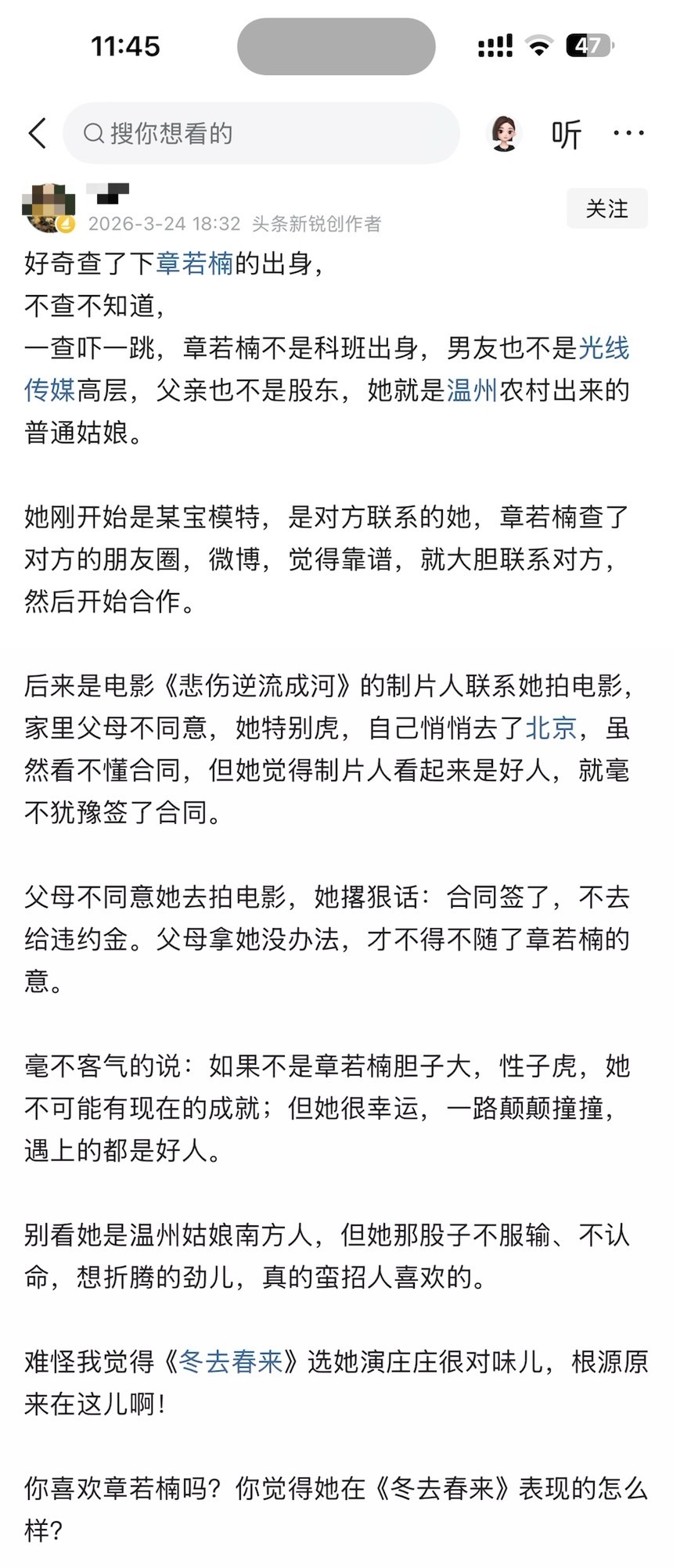 好奇查了下章若楠的出身,不查不知道,一查吓一跳