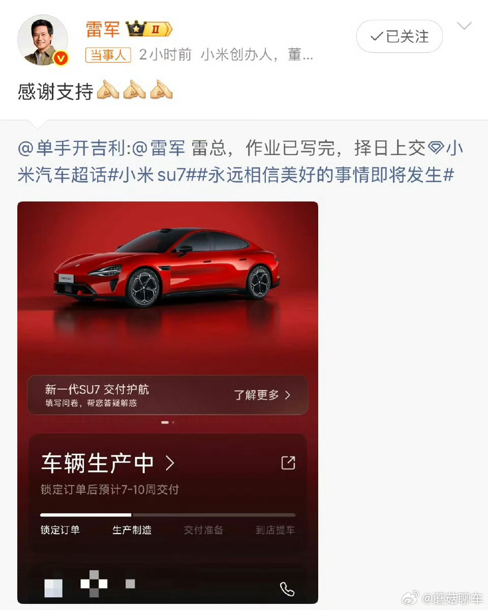 被雷军回复网友已购入小米新SU7实名羡慕了……既羡慕被雷军翻牌子回复,又羡慕有钱秒换车~还是那句话:你开过新su7你就知道为什么选它!