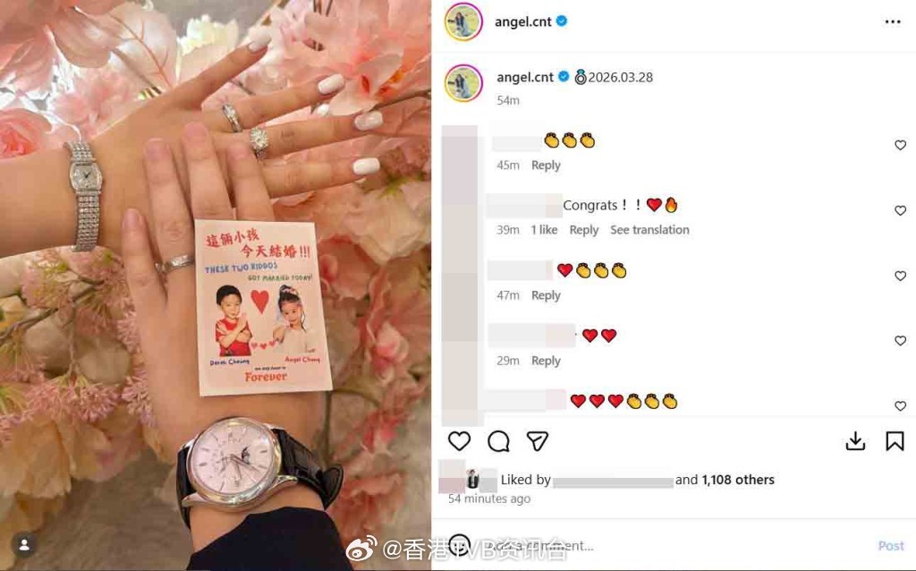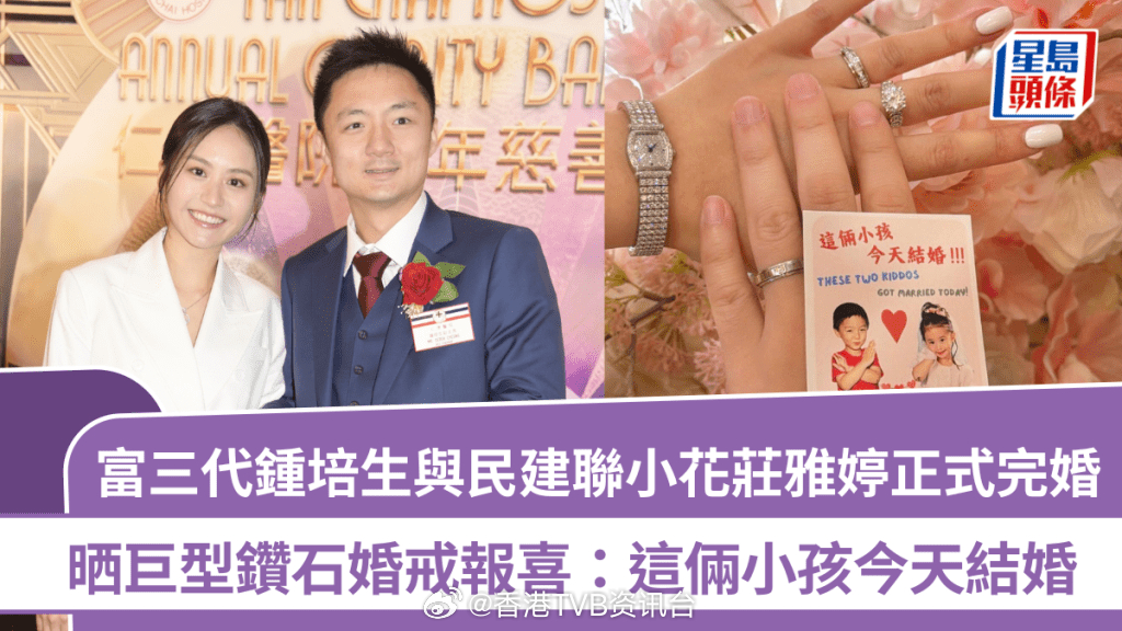 富家子钟培生(Derek)今日(3月28日)正式与民建联西贡区议员庄雅婷(Angel)结婚。庄雅婷今日在IG高调宣布喜讯,上传了一张与丈夫钟培生手叠手的温馨照片,并甜蜜发文:“2026.03.28”。照片中,两人一同展示新婚戒指,庄雅婷手上戴着一颗巨型钻戒,闪耀夺目,钟培生则佩戴简约设计的婚戒。《星岛头条》向钟培生方面求证婚讯,他对结婚一事没有回应,但透露稍后会准备礼物与传媒分享喜悦。