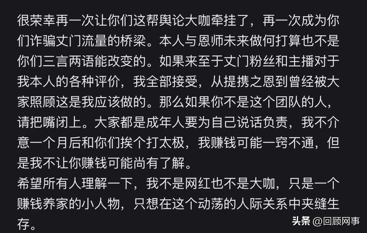 李舒克发文,请求大家给我一口互联网的饭! 李舒克发文:很荣幸再一次让你们这帮舆论大咖牵挂了,再一次成为你们诈骗丈门流量的桥梁。 本人与恩师未来做何打算,也不是你们三言两语能改变的。如果来至于丈门粉丝和主播对于我本人的各种评价,我全部接受,从提携之恩到曾经被大家照顾这是我应该做的。 那么如果你不是这个团队的人,请把嘴闭上。大家都是成年人要为自己说话负责,我不介意一个月后和你们挨个打太极,我赚钱可能一窍不通,但是我不让你赚钱可能尚有了解。 希望所有人理解一下,我不是网红也不是大咖,只是一个赚钱养家的小人物,只想在这个动荡的人际关系中夹缝生存。
