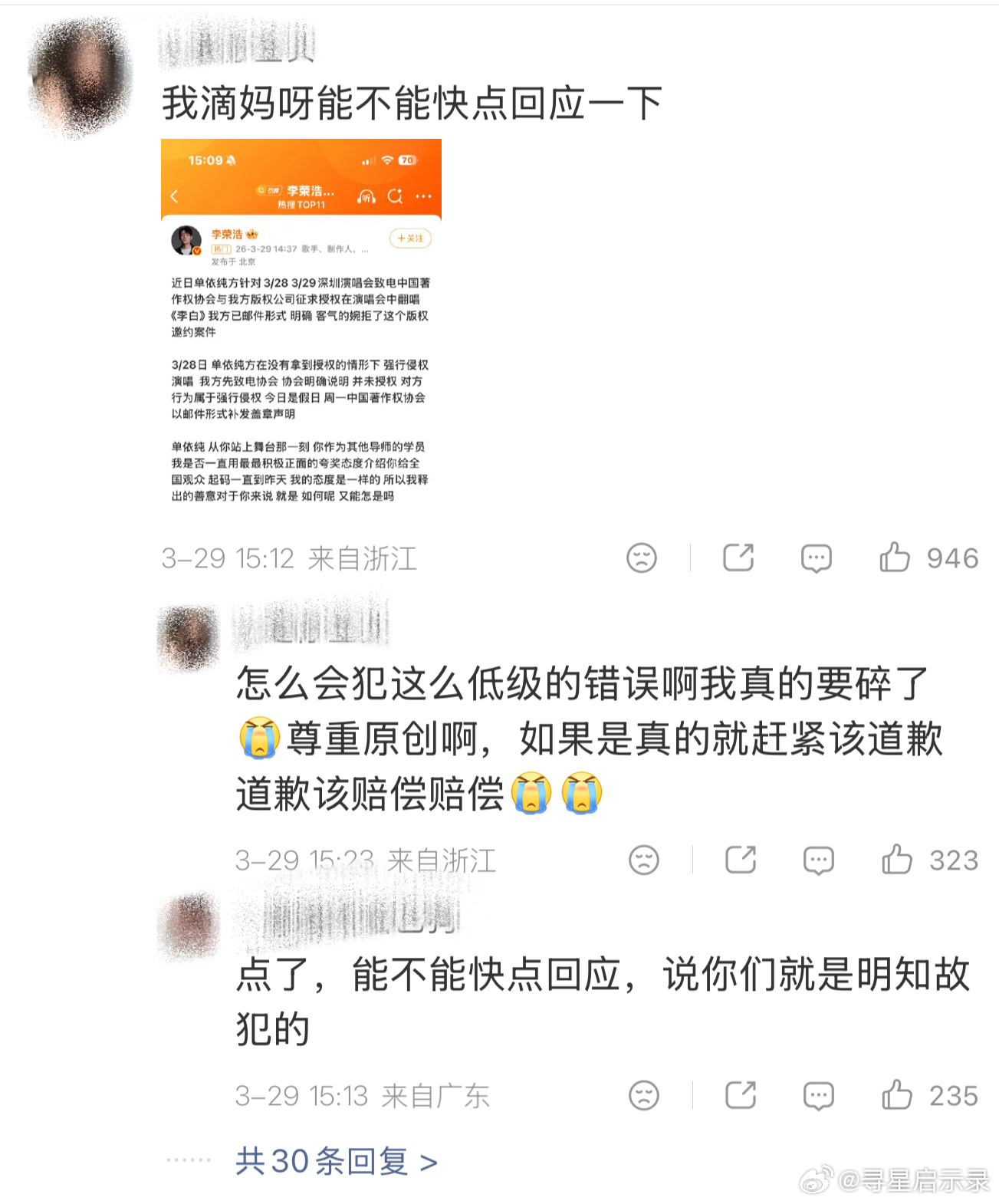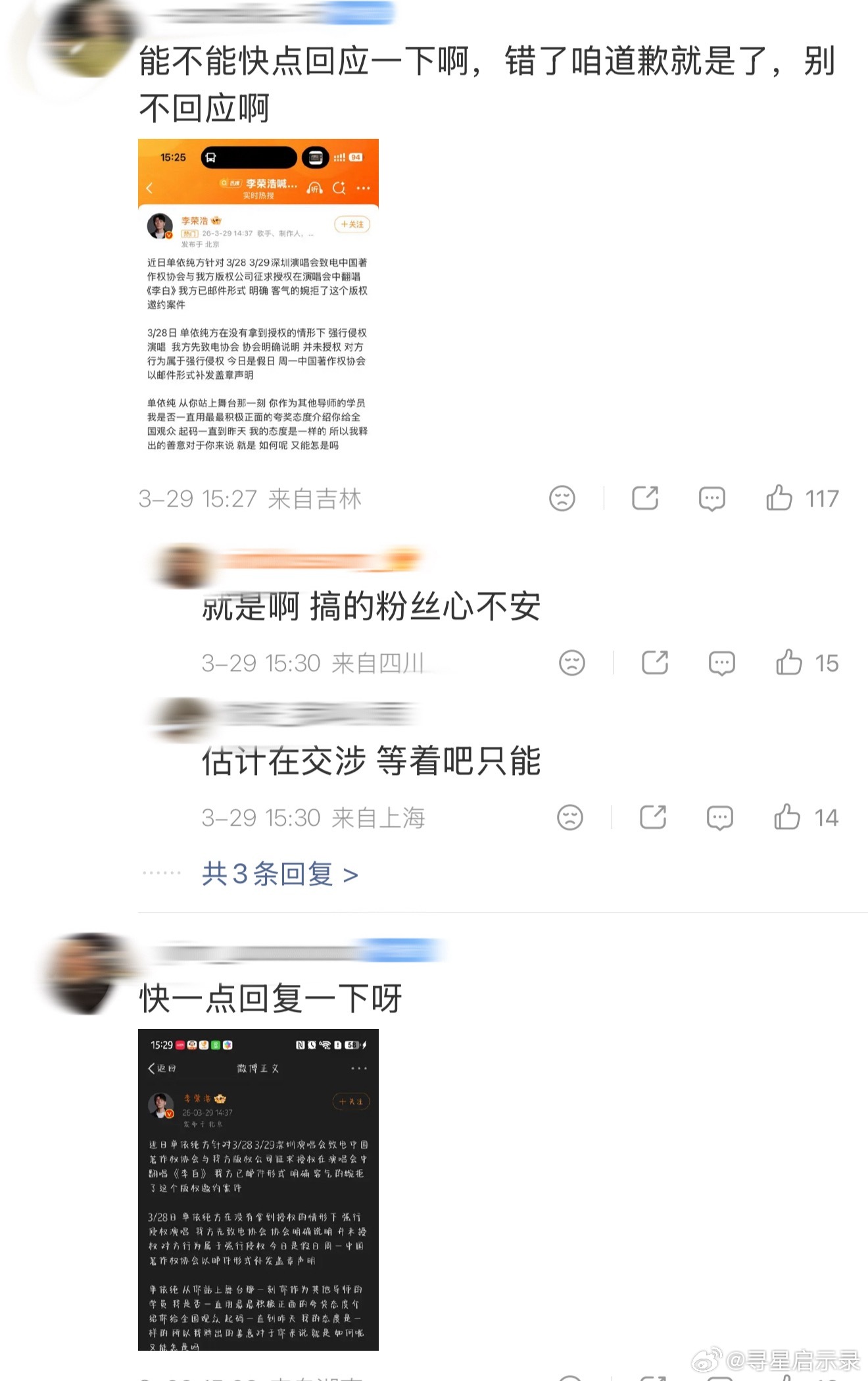 现在单依纯粉丝在工作室下面满屏求工作室回应,让工作室给李荣浩道歉