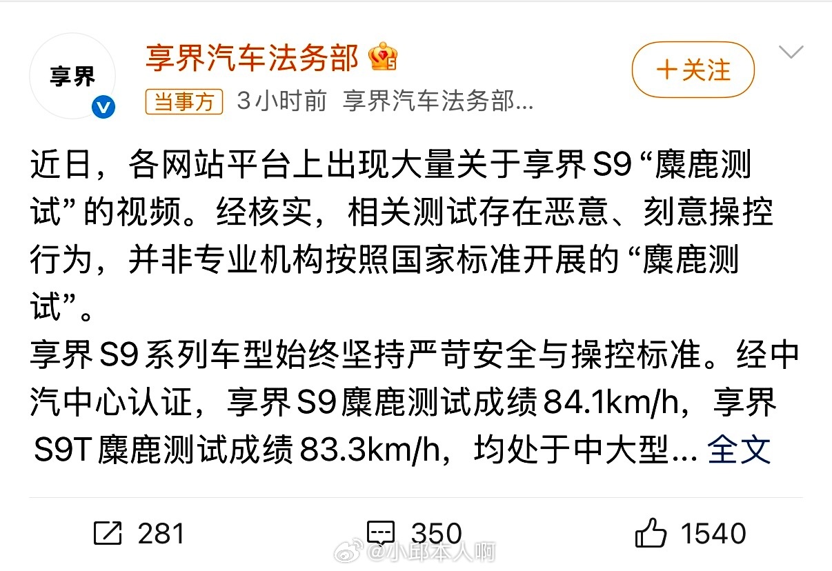 针对网上流传的享界S9“麋鹿测试”失控视频,官方回应称:视频是假的,有人恶意操控。