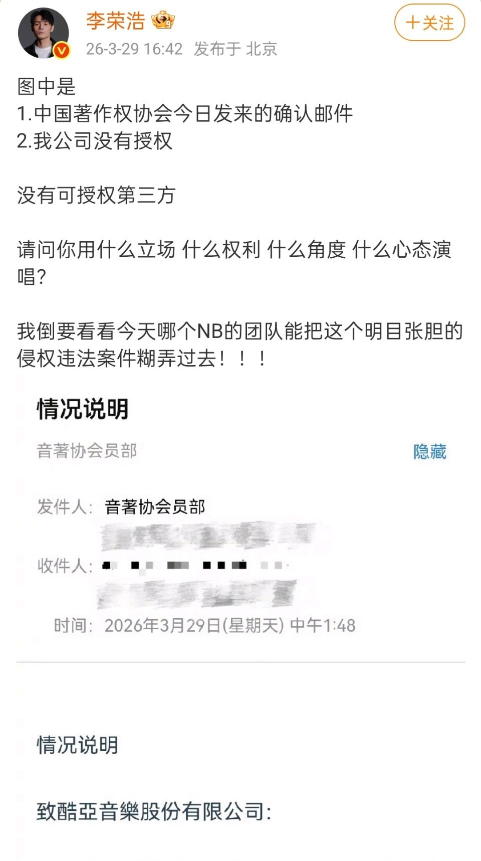 李荣浩再发文,晒出了著作权协会今天下午1点48分确认没有发放任何《李白》授权,并