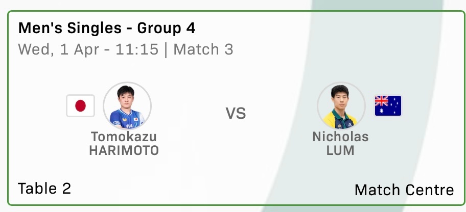 ▶️男单 小组赛第二轮张本智和 vs 林文政北京时间:2026年4月1日11:15,T2
