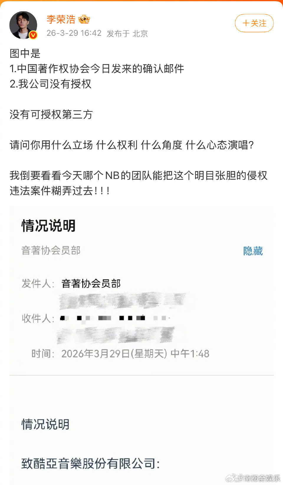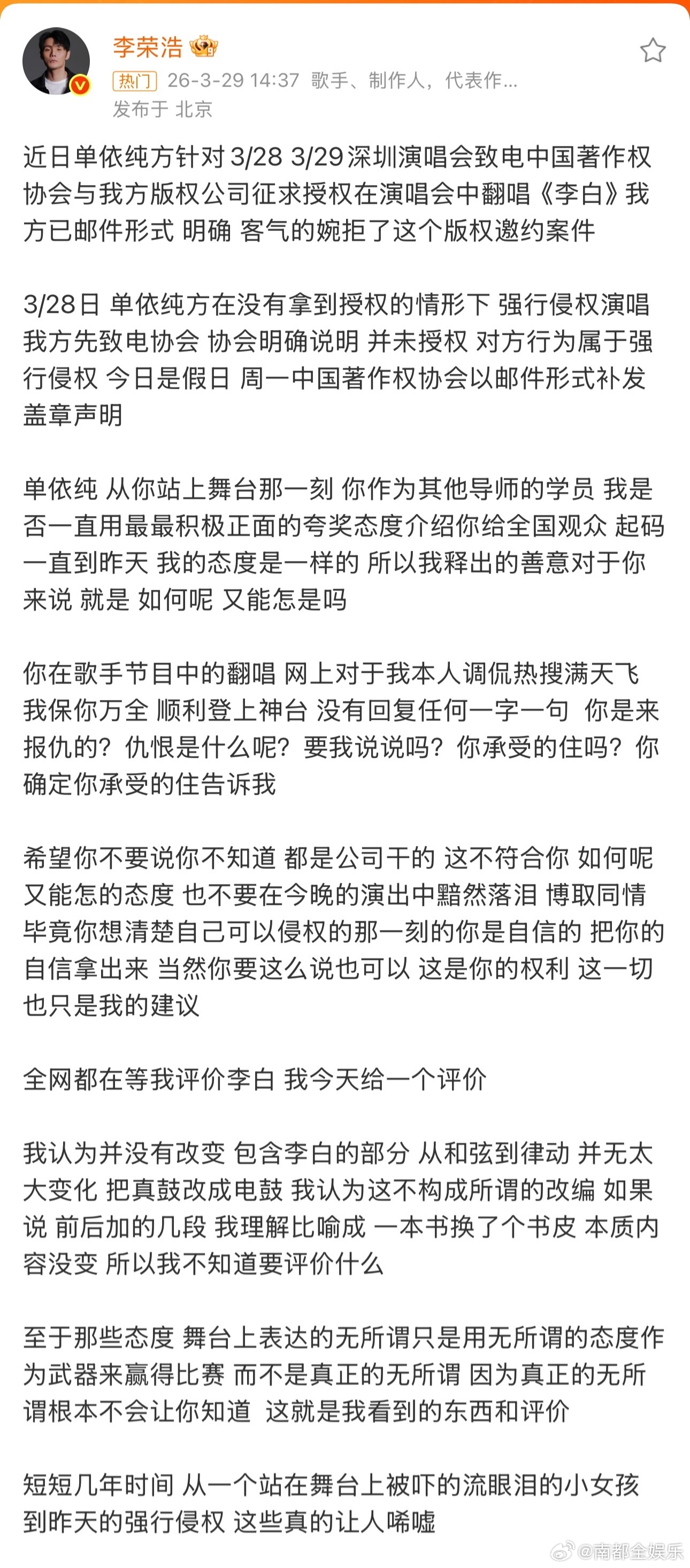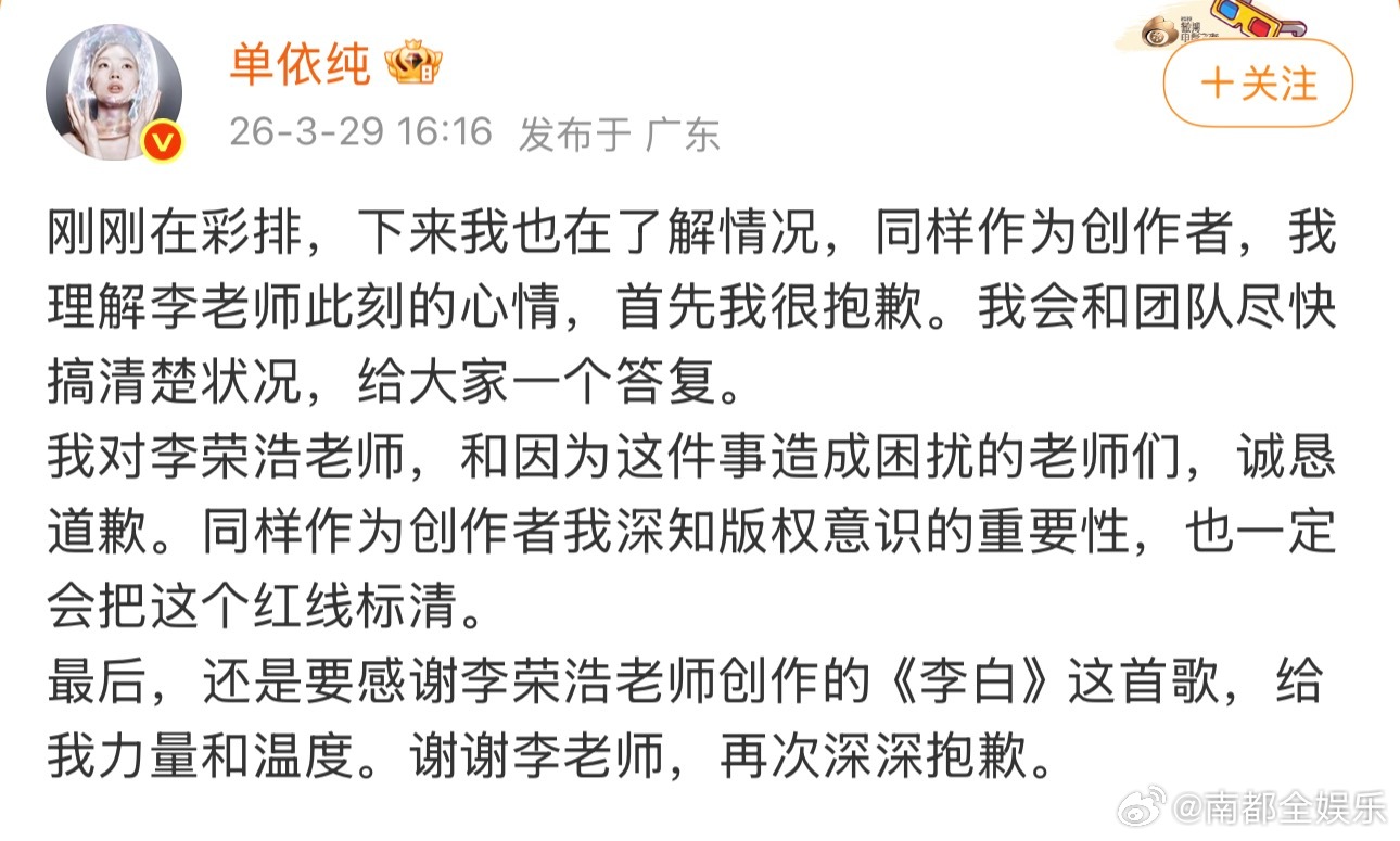 随后,发文回应,表示已在核实情况,将尽快给出答复。同时,也向及受此事困扰的各方致歉:“同为创作者,我深知版权意识的重要性,也一定会把这条红线标清。”“还是要感谢李荣浩老师创作的《李白》这首歌,给我力量和温度。谢谢李老师,再次深深抱歉。”李荣浩 单依纯强行侵权