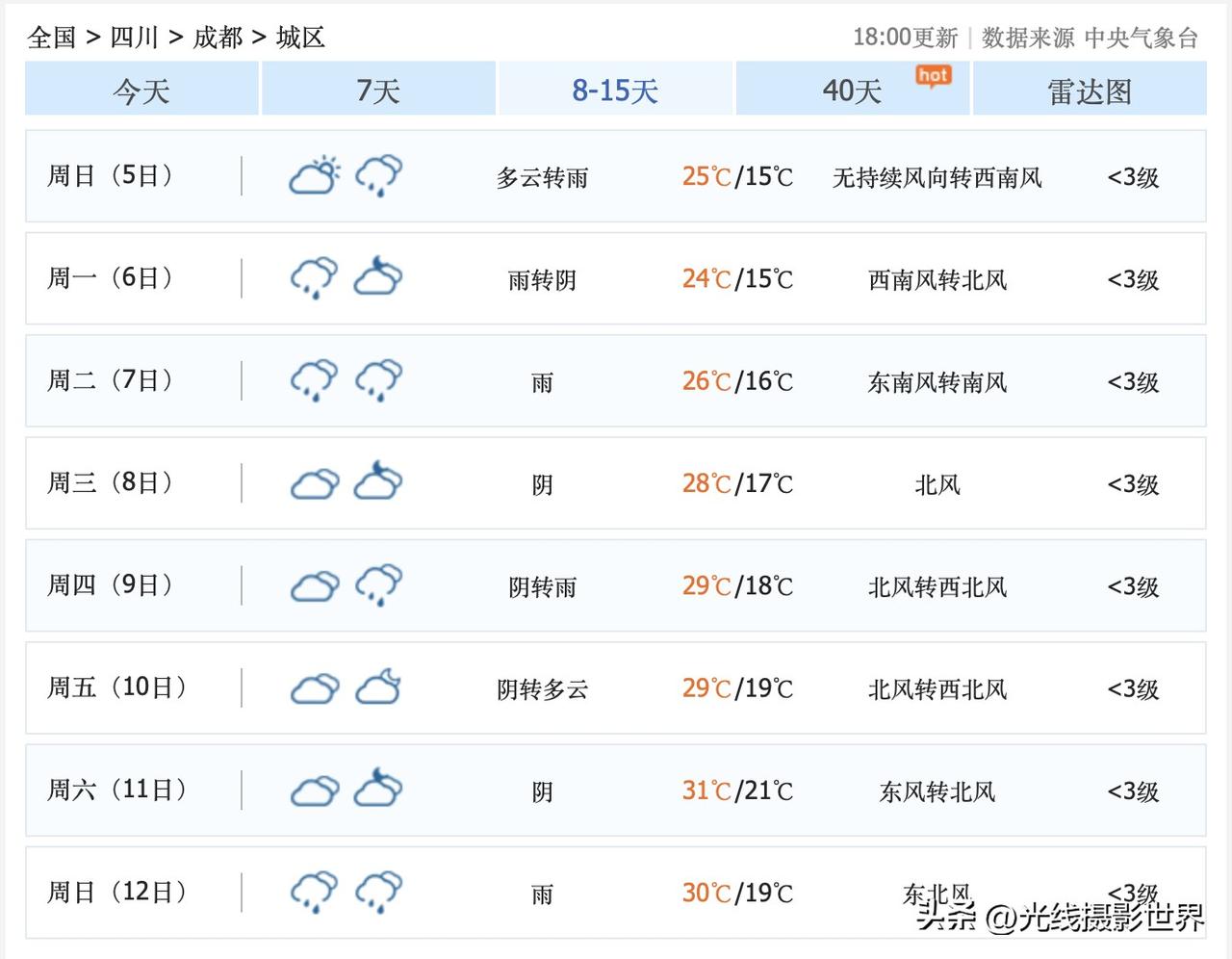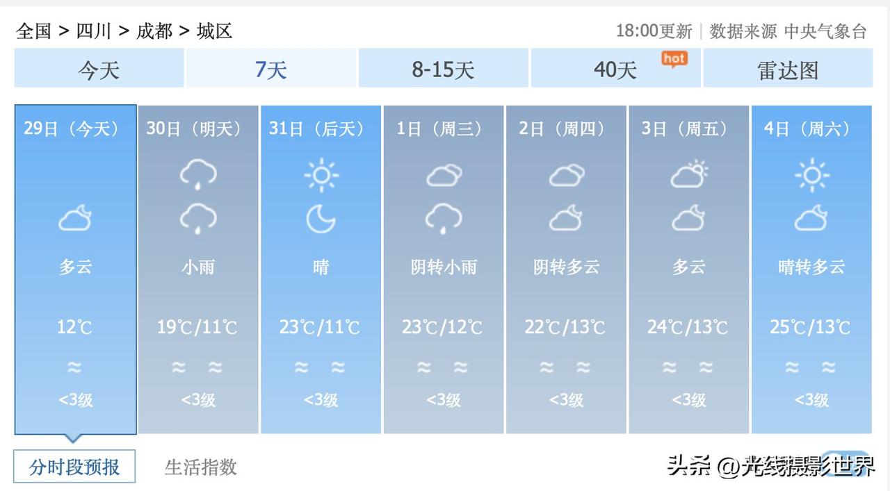 不错不错!4月2日到5日,四川省成都市,基本不下雨,经常出太阳!太棒啦!中央气象台的最新天气预报……3月31日,星期二,成都晴天……太棒啦! 4月1日,星期三,成都阴转小雨。 4月2日,星期四,成都阴转多云。 4月3日,星期五,成都多云。 4月4日,星期六,成都晴转多云。 4月5日,星期天,成都多云转雨。 …… 好吧,总体来说,春假和清明节假期的前两天,成都天气应该会比较不错,适合出游!