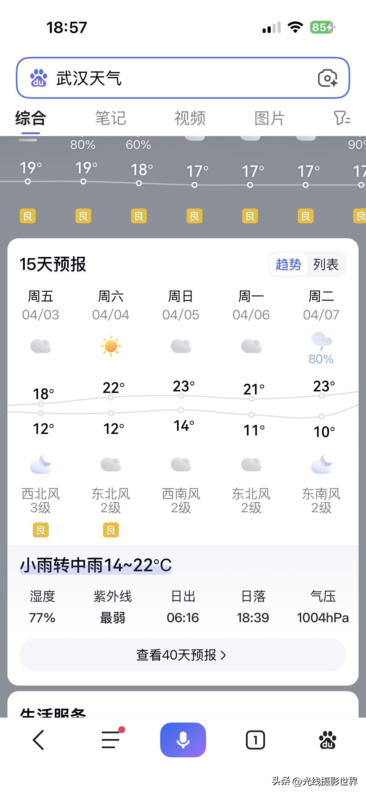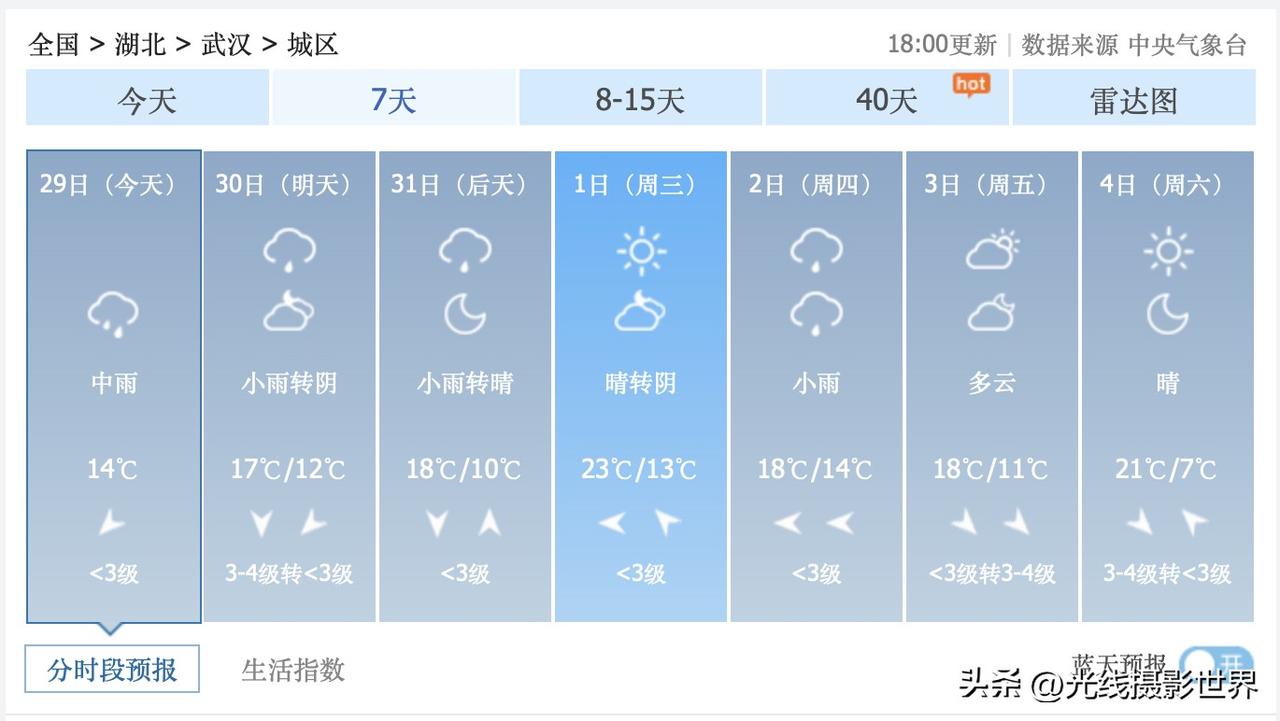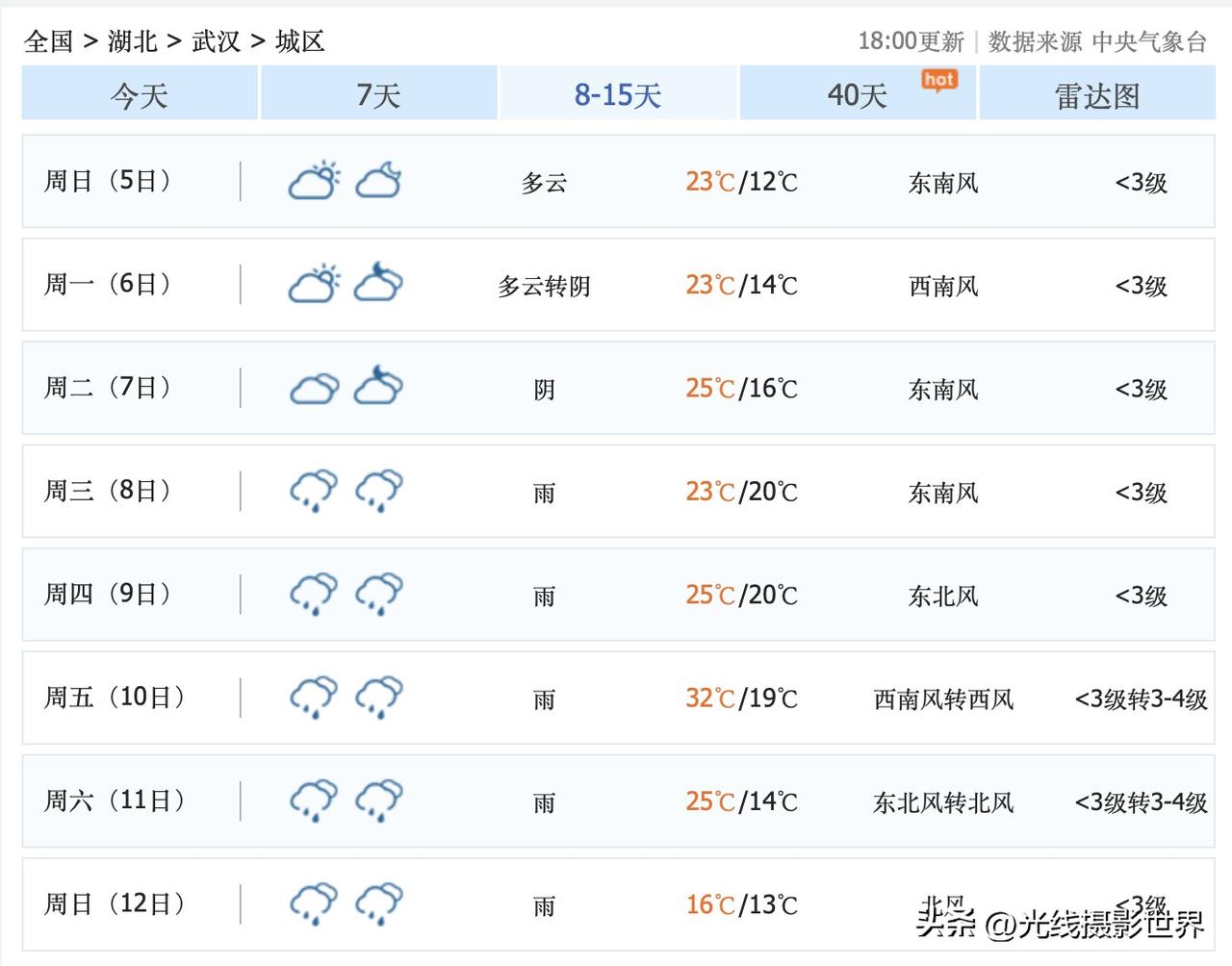 不会吧?!4月4日到6日,湖北省武汉市,要出太阳啦?!清明节假期,中央气象台的最新天气预报来啦!虽然最近几天武汉经常下雨……但是……4月3日开始,武汉市可能会持续不下雨……可能会经常出太阳! 3月30日,星期一,武汉小雨转阴。 3月31日,星期二,武汉小雨转晴。 …… 4月2日,星期五,武汉小雨。 4月3日,星期六,武汉多云。 4月4日,星期天,武汉晴天。 …… 如果真是这样,那也太令人意外和惊喜啦! 2026年春季赏花,樱花,桃花,最近已经是尾声啦! 清明节,武汉及周边,大家去哪里看花?!去麻城看杜鹃花吗?! 麻城的杜鹃花还是非常有名的!