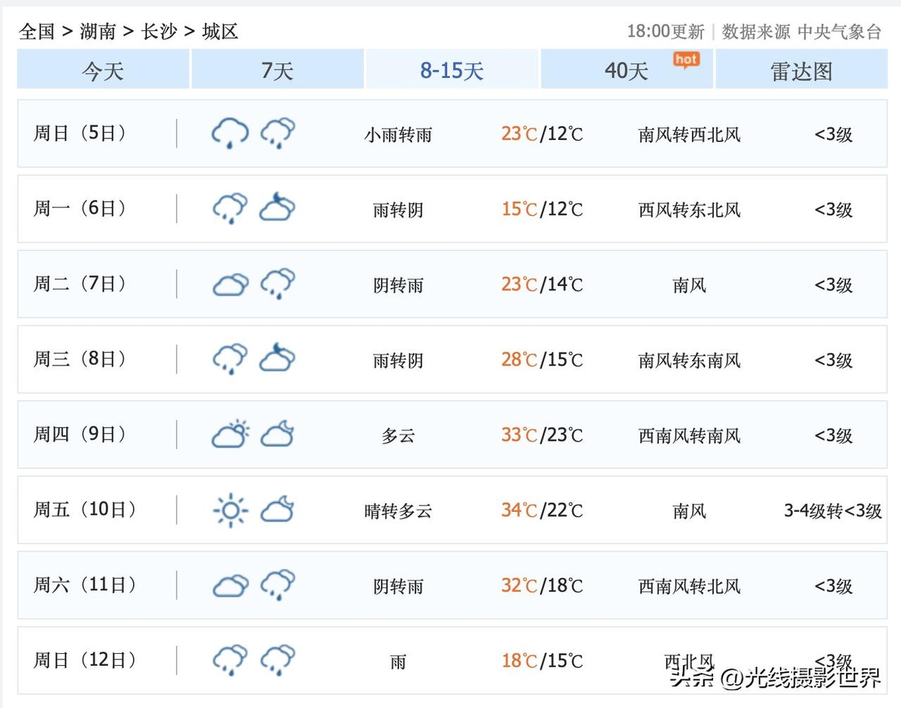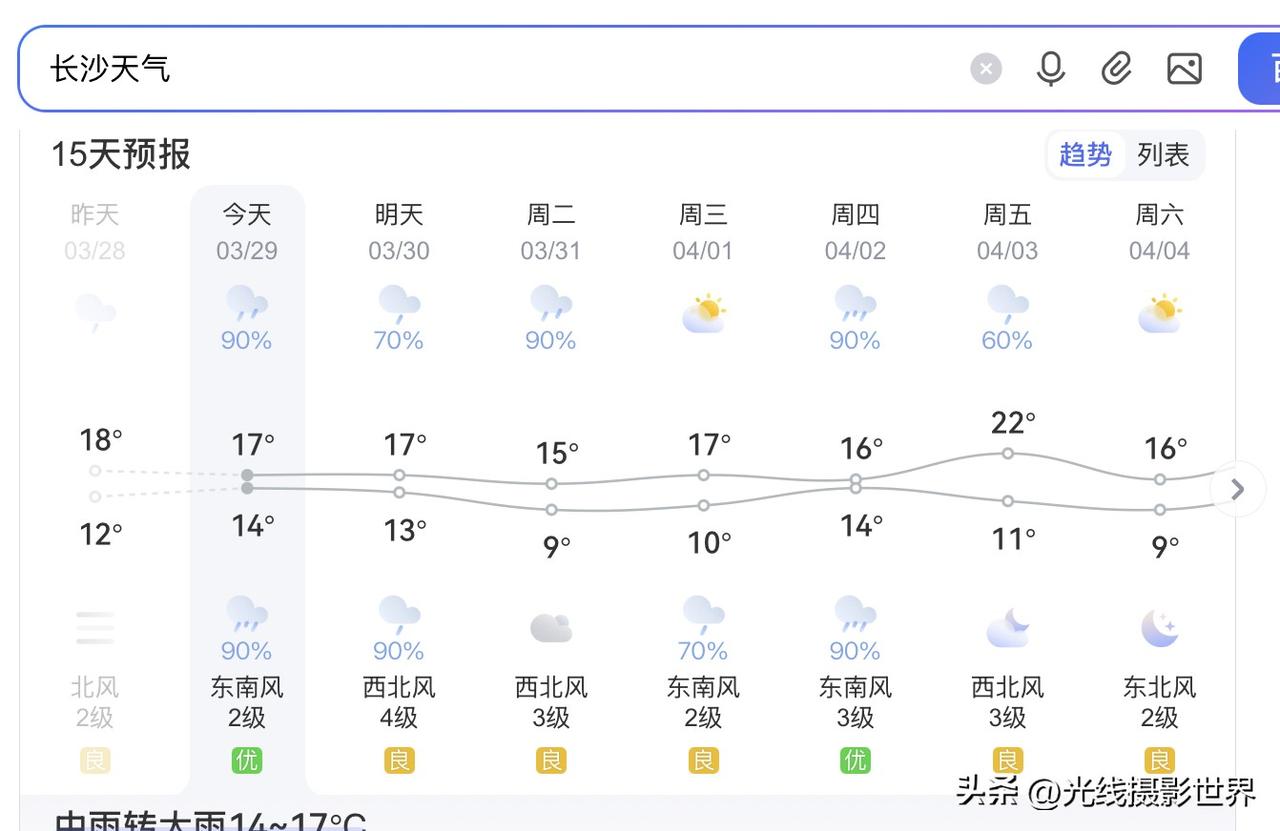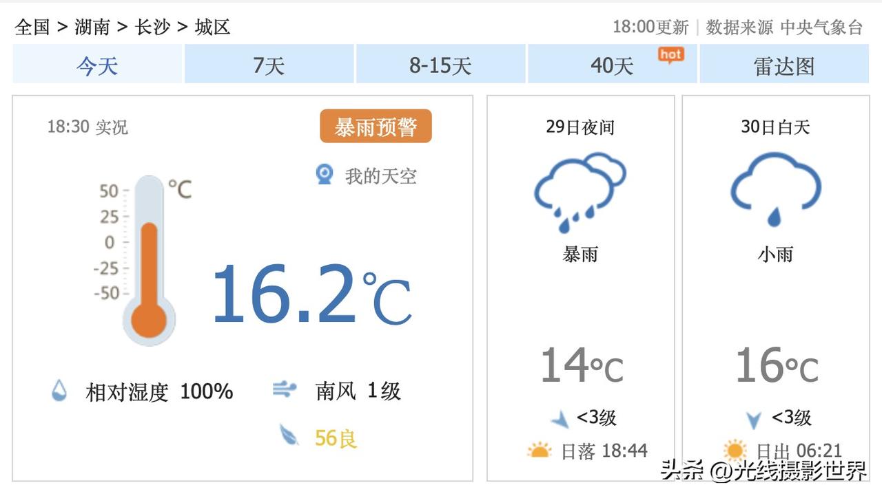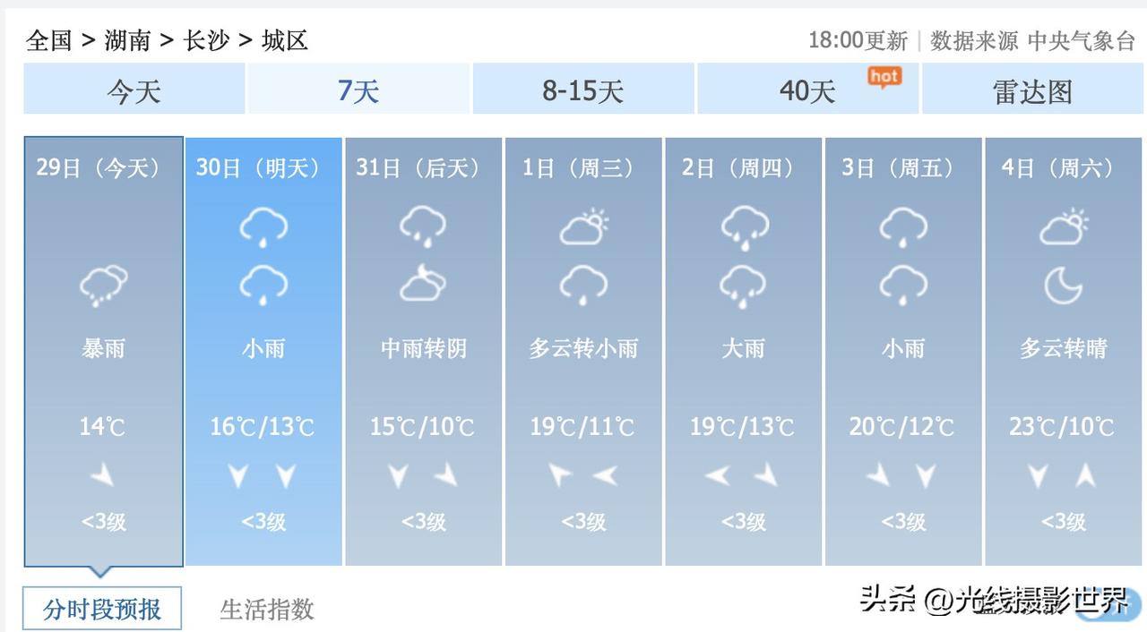 今晚,长沙暴雨!3月29日晚上到明天傍晚,沪昆高铁,上海--杭州--南昌--长沙,大范围大雨来袭!最近,长沙的雨水,确实够多的呢! 不过,好在,中央气象台的最新天气预报认为,4月1日和4日,长沙市有可能出太阳……只是,总体来说,未来10天,长沙市,阴雨天可能依旧是主旋律…… 4月3日,星期四,长沙大雨。 4月4日,星期五,长沙小雨。 4月5日,星期六,长沙多云转晴。 4月5日,星期天,长沙小雨转雨。 …… 湖南的朋友们,最近出门要晴带雨伞……同时,最近可以多买点袜子内裤啥的……这鬼天气,太难了。
