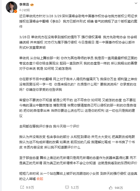 随后单依纯回应李荣浩 单依纯强行侵权,称会尽快了解情况,给大家一个答复。她向李荣浩道歉:“还是要感谢李荣浩老师创作的《李白》这首歌,给我力量和温度。谢谢李老师,再次深深抱歉。”