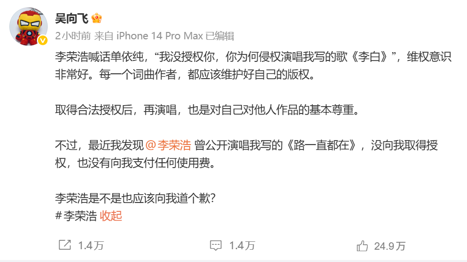 接着,歌手吴向飞喊话李荣浩道歉 ,称他发现李荣浩曾公开演唱自己写的《路一直都在》,没取得授权,也没有向自己支付任何使用费,并说“李荣浩是不是也应该向我道个歉?”