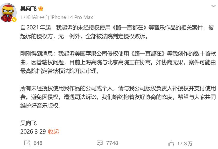 李荣浩回复后,吴向飞再发文公布歌曲维权最新进展,并称“所有未经授权使用我作品的公司或个人,请与我公司版权负责人补授权并支付使用费。”但并未具体回复李荣浩诉求。