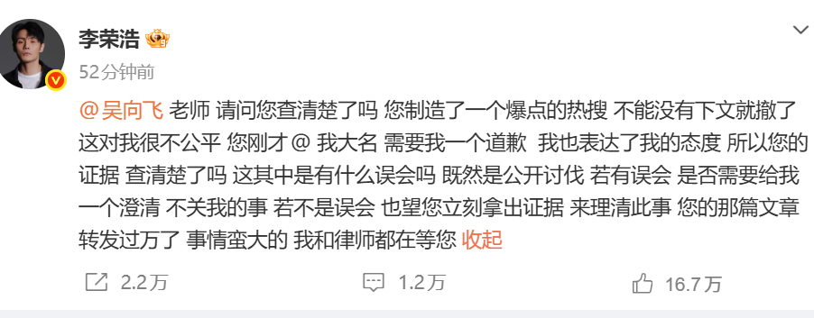 未得到准确答复的李荣浩再发文回应吴向飞,询问他有没有查清楚,“您制造了一个爆点的热搜,不能没有下文就撤了,这对我很不公平” ,他说若有误会,是否需要给自己一个澄清,若不是误会,也望吴向飞能立刻拿出证据来理清此事,“您的那篇文章转发过万了,事情蛮大的,我和律师都在等您”。