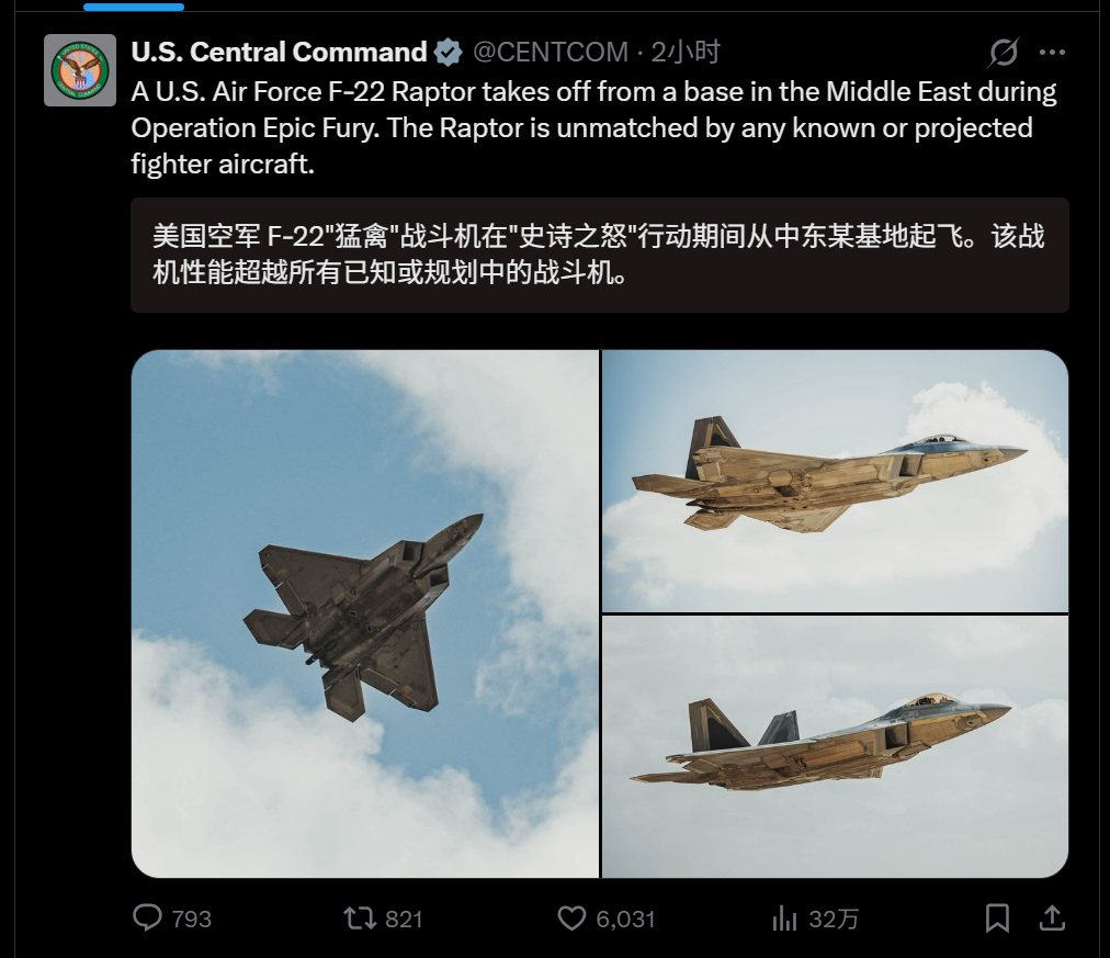 🔻美军中央司令部:“美国空军 F-22"猛禽"战斗机在"史诗之怒"行动期间从中