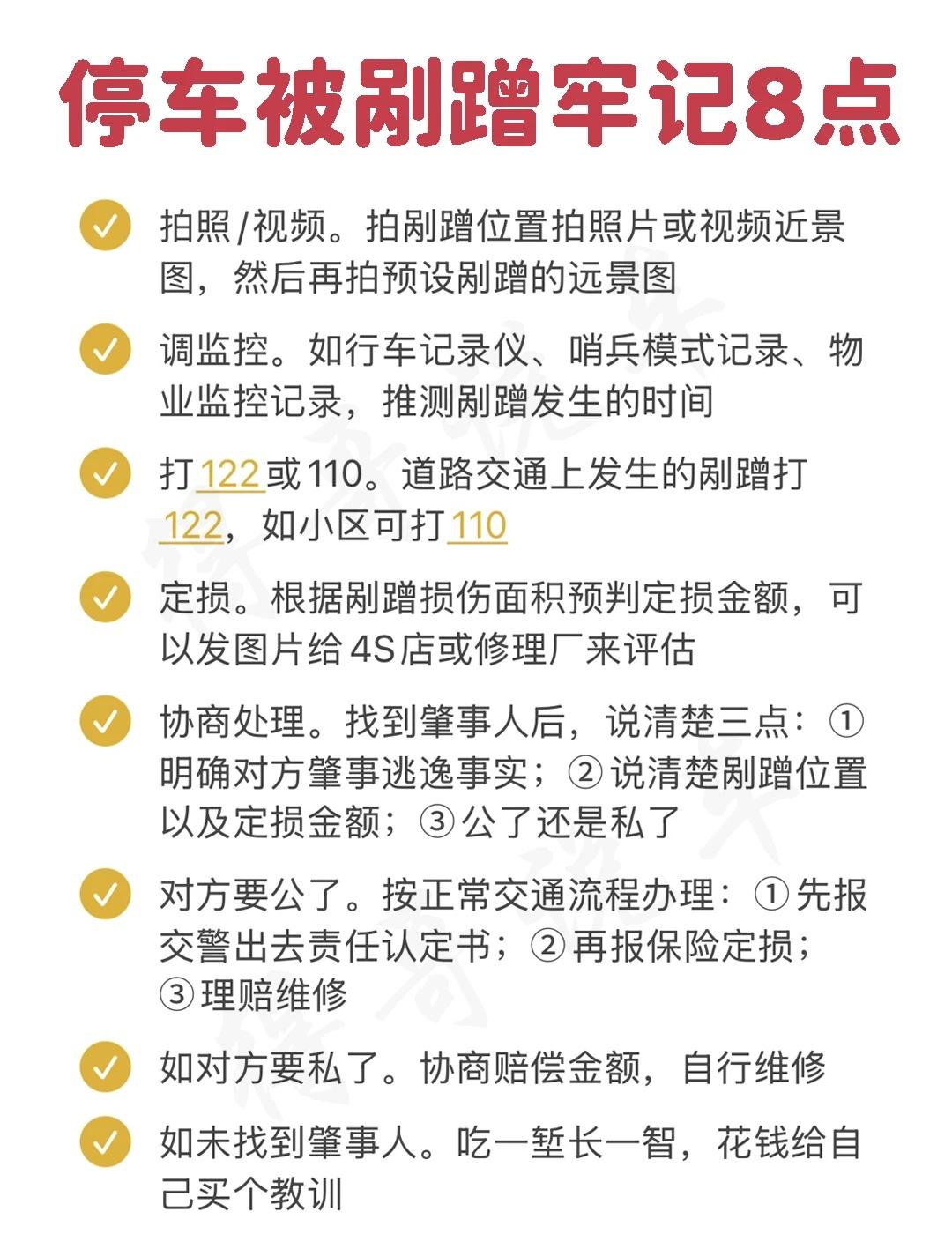 停车被剐蹭了,千万别吃哑巴亏! 🤔停车后被剐蹭,关键对方还跑了,这时候该怎么办?今天教你正确的处理流程👇 1️⃣拍照/视频。拍剐蹭位置照片或视频近景图,然后再拍预设剐蹭方位的远景图 2️⃣调监控。如行车记录仪、哨兵模式记录、物业监控记录,推测剐蹭发生的时间 3️⃣打122或110。道路交通上发生的剐蹭打122,如小区可打110 4️⃣定损。根据剐蹭损伤面积预判定损金额,可以发图片给4S店或修理厂来评估 5️⃣协商处理。找到肇事人后,说清楚三点:①明确对方肇事逃逸事实;②说清楚剐蹭位置以及定损金额;③公了还是私了 6️⃣如对方要公了。按正常交通流程办理:①先报交警出去责任认定书;②再报保险定损;③理赔维修 7️⃣如对方要私了。协商赔偿金额,自行维修 8️⃣如未找到肇事人。吃一堑长一智,花钱给自己买个教训 新手开车 开车 车被刮蹭怎么办 车被剐蹭 停车 停车剐蹭 停车剐蹭解决方法 得哥说车 保险理赔