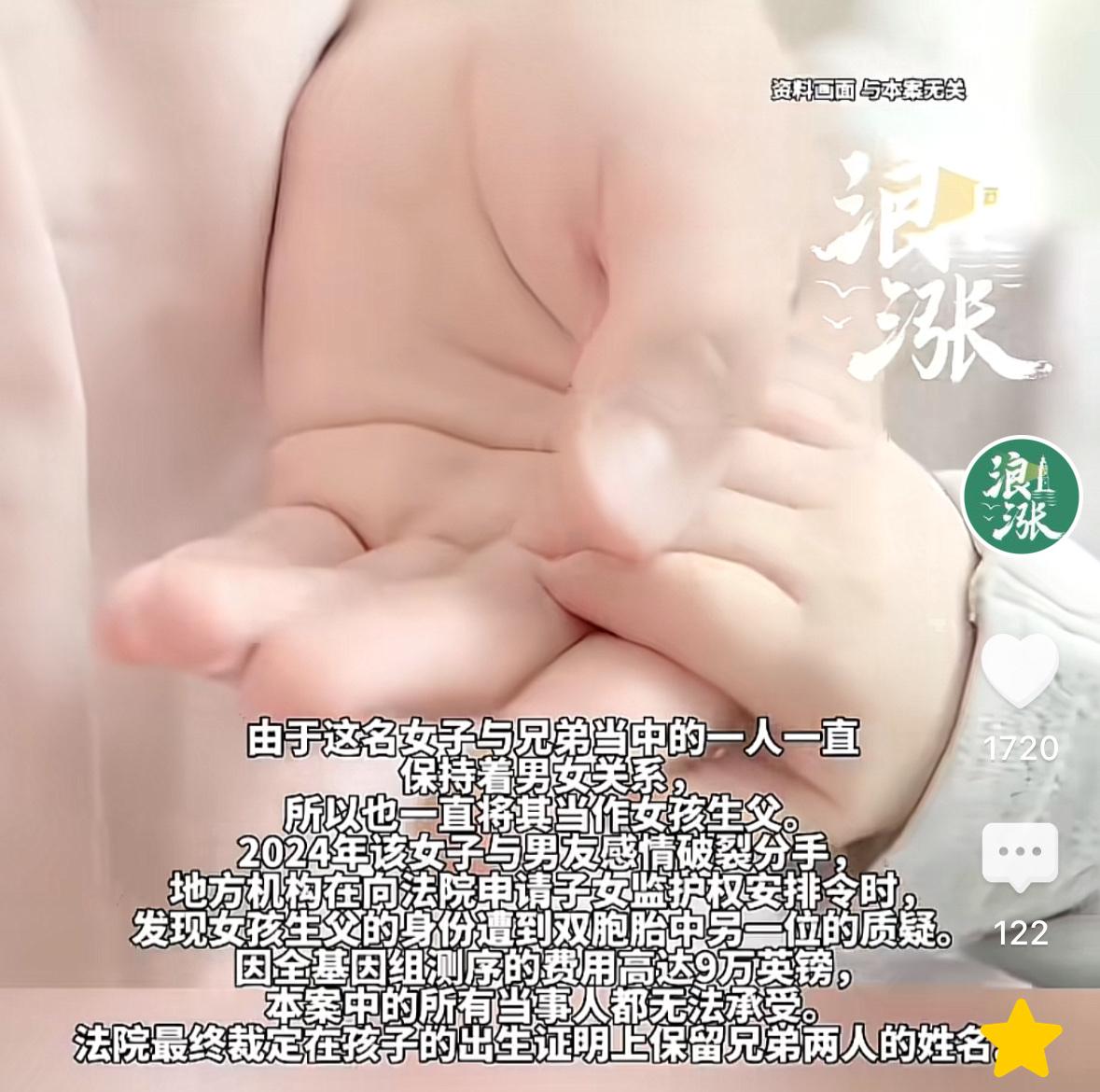 小说都不敢这么写!女子在一周内,先后与一对双胞胎兄弟发生关系,没多久便怀孕了。女子选择与其中一位长期保持男女朋友关系。次年,女子生下一个女儿。这对兄弟都认为,女儿应该是自己的。此事闹到了法院,兄弟俩均去做了DNA鉴定,但各自是女孩儿生父的可能性各占50%。要想揭晓确切答案,只能去做全组DNA检测,可费用却高达9万英镑,涉案3人均无承担能力,最终法院这样判了! 天下之大,无奇不有。 近日,英国一家法庭审理了一起极其特别且令人惊叹的案例。 一对双胞胎兄弟,在对方都不知情的情况下,先后与同一名女子发生了关系。 由于国外的文化比较开放包容,三人知道此事后,并没有觉得尴尬和难堪。 女子也并没有因此就远离两位兄弟,而是选择了和其中一位(男1)建立了男女朋友关系。 没过多久,女子便发现自己怀孕了。 她和男1商量后,决定生下这个小孩。 女子整个孕期都被男1照顾得很好,两人也都很期待这个新生命的到来。 可此时,双胞胎兄弟的另一个,也就是男2,心里犯起了嘀咕,他算算日子,觉得,女子腹中的孩子,也有可能是他的。 可碍于兄弟情分,再加上女子和男1的感情很稳定,男2便把这个猜测烂在了肚子里。 次年,女子诞下一名女婴,很可爱,男1对女儿很爱护。 两人立下誓言,要一起守护女儿长大,要给她开心快乐的童年。 然而,海誓山盟的誓言,有时候也只是在发誓的那一刻,真的可信。过后,就是一句说过的话而已,无足轻重,轻飘飘的。 两人在一起相守了七年, 于2024年和平分手。 两人分手后,最大的问题,就是孩子,她的成长过程中,必须要有监护人。 但是,地方机构在向法院申请子女监护权安全令时,发现女孩生父的身份遭到双胞胎中的另一位,也就是男2的质疑。 然而,接下来的事情,却让法院的审理人员犯了难。 在分别给女孩儿和双胞胎兄弟做了基因比对后,依然分不出到底谁是女孩儿的生父。 一般的亲子鉴定,通常只取父亲DNA的一小部分区域,与孩子的DNA进行对比。 但由于男1和男2是同卵双胞胎,也就是说,他们两位的DNA大差不差。 所以,经过亲子鉴定后,男1和男2是女孩儿生父的可能性各占50%。 像这种情况,想要得知女孩儿的生父,只能对这对双胞胎的整个DNA进行分析。 但这种分析需要高达9万英镑的检测费用,而这对双胞胎以及女孩儿生母三人,均无力承担这笔高昂的费用。 最终,法院裁定,在孩子的出生证明上写上了双胞胎兄弟两个人的名字。 站在小女孩的角度讲,可能也并不会觉得多一个爹当监护人,是多么幸福的事情。 相反,这样的结果可能会对她以后的成长造成一定的困扰。 但话又说回来,国外的文化包容度比较大,开放程度也较高,或许在他们看来,这都不是什么稀奇的事儿。 对此,你怎么看!