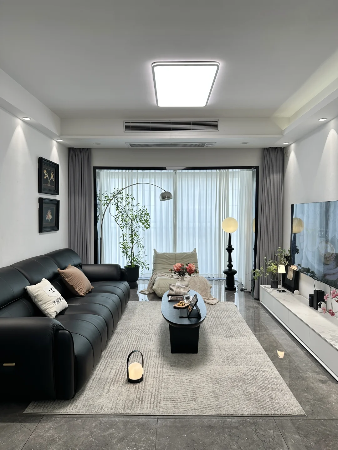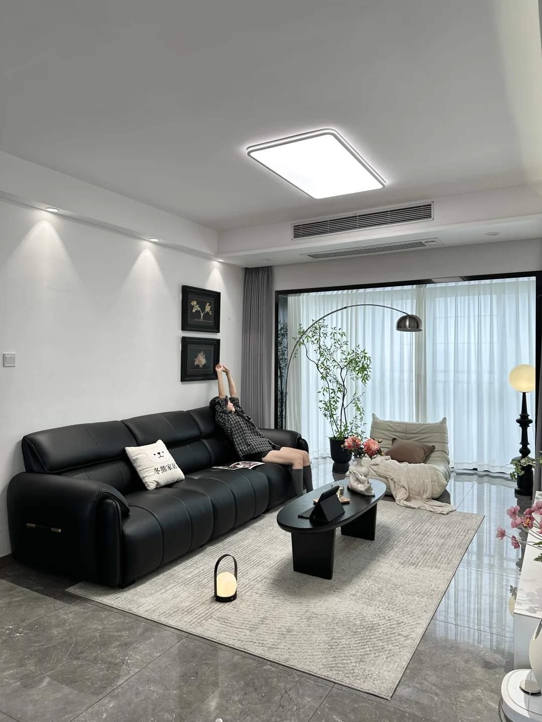 沙发背景墙3.2米,沙发我选的是冬熊大象耳朵沙发,长度是2.8米,两边预留一点位置刚刚好,小户型选直排沙发特别适合还不占空间!黑色沙发和我家整体软装很搭配,高级感满满[赞R]
