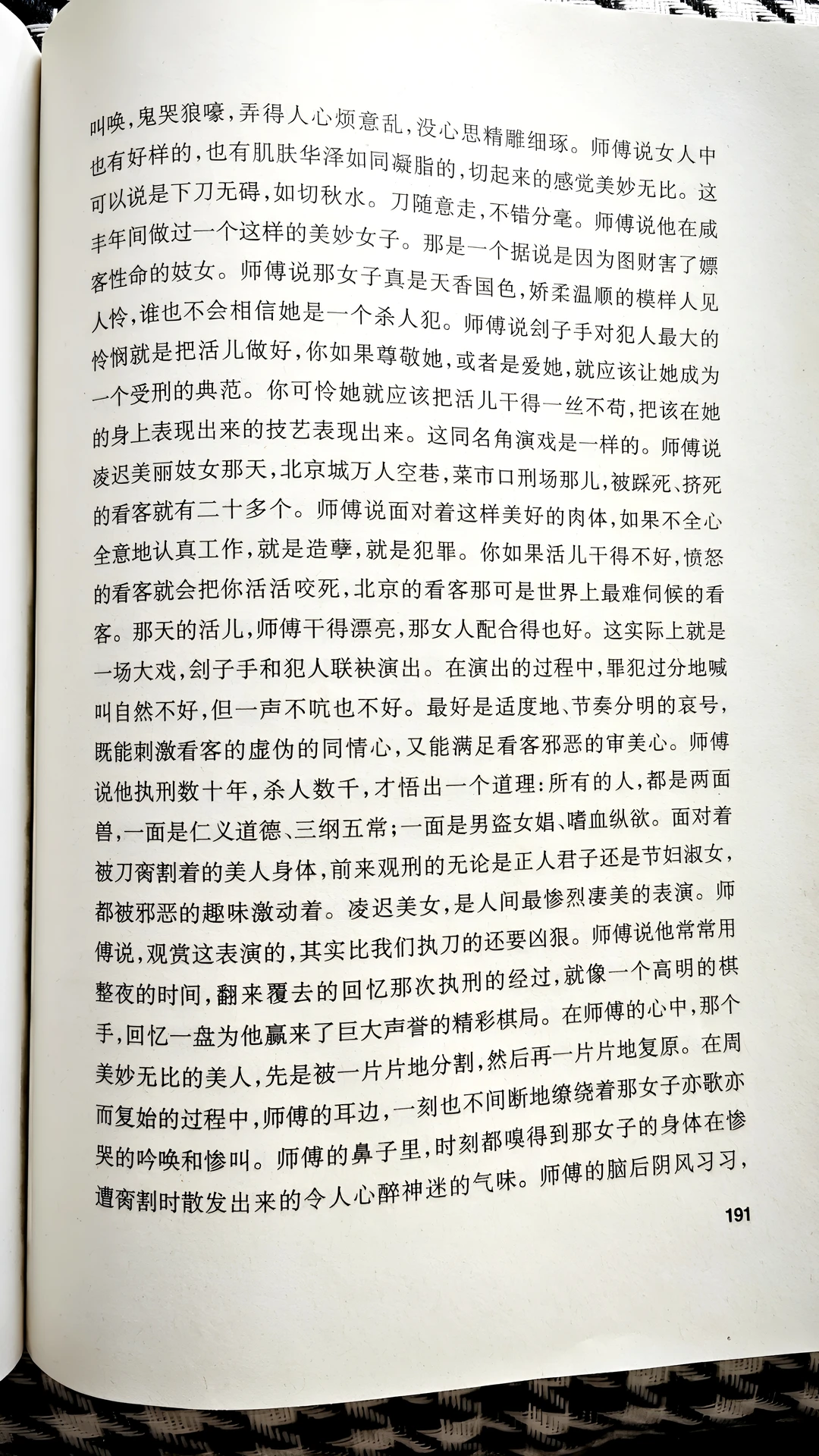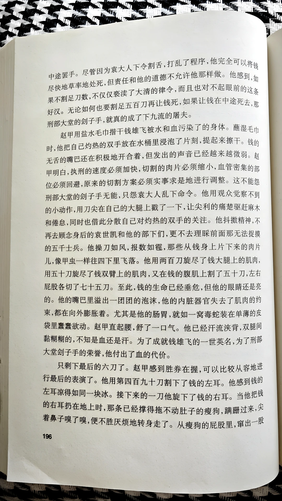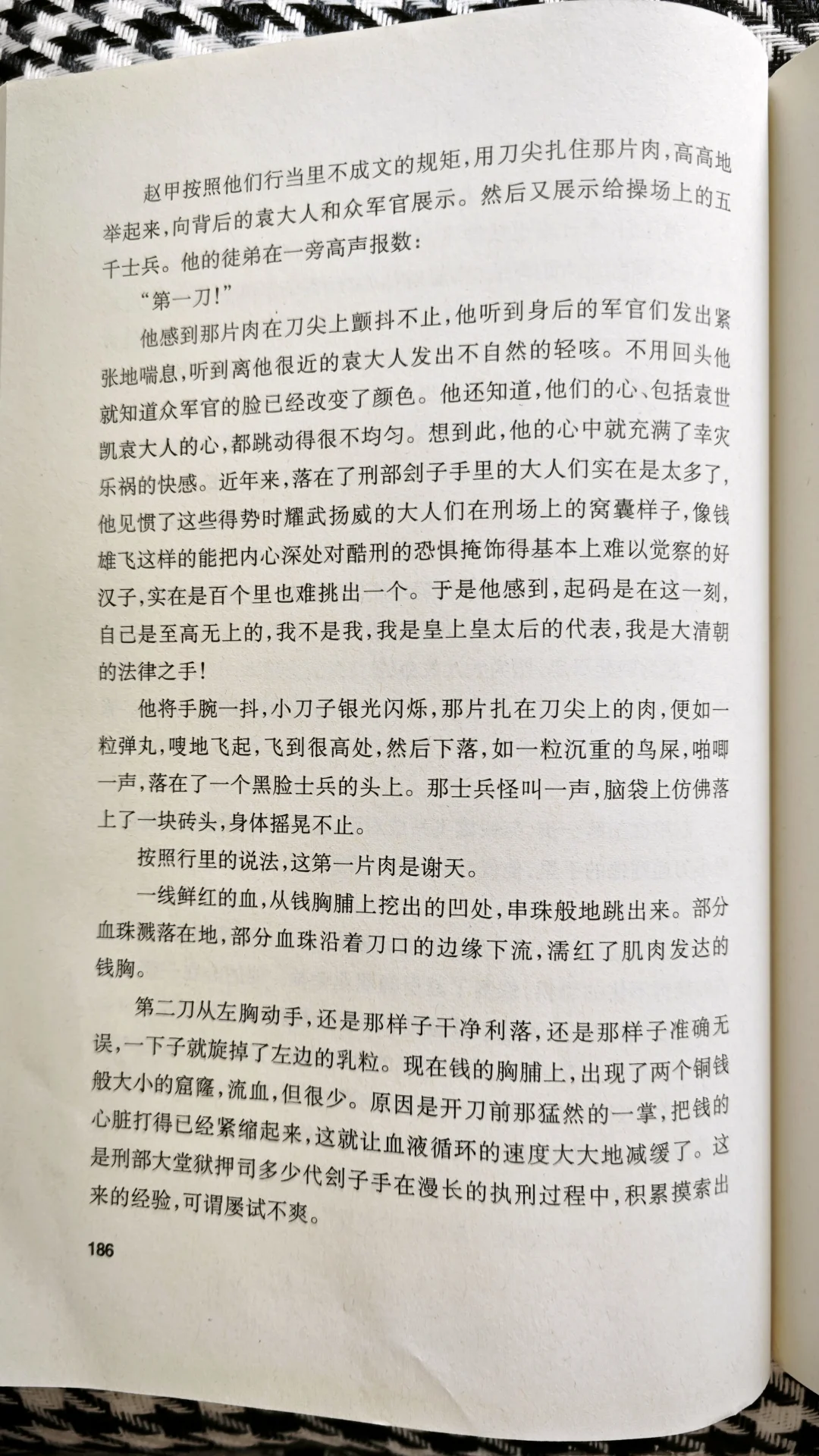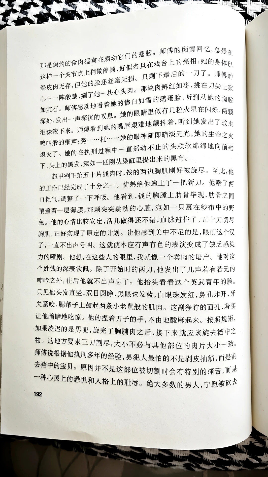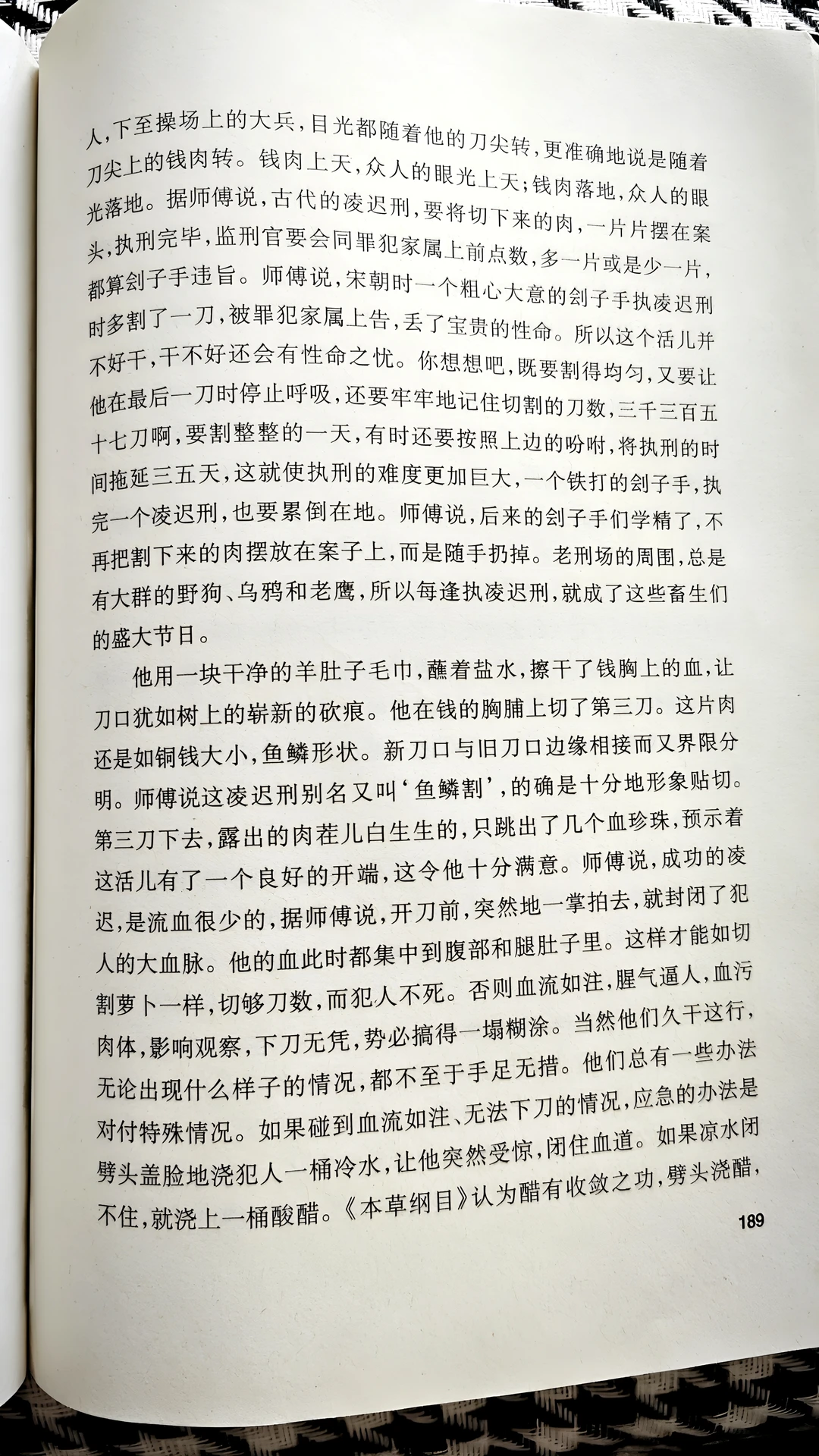 这段内容,是莫言的《檀香刑》里对古代酷刑“凌迟”的还原。刽子手赵甲是刑法执行者,他将杀人变成了“艺术”[石化R] 受刑者是行刺袁世凯未遂的钱雄飞。刑罚的核心要求是: 1.精准(肉片大小均匀)、2.足量(本次刑量定为五百刀,这是清代最高规格)、3.致死(直到最后一刀才能让犯人致命)。 赵甲先猛拍钱雄飞的心窝一掌,封闭钱雄飞的血脉,减缓血液循环,防止大出血,保证行刑过程的清晰度。 从右胸开始,以“鱼鳞割”的手法,每刀旋下铜钱大小的肉片,挑在刀尖示众(谢天、谢地、谢鬼神),并由徒弟高声报数。 然后是四肢与躯干,依次割削双臂、双腿、腹肌及臀部肌肉。过程中赵甲需控制手速与力度,确保在未毙命的前提下完成既定刀数。 身体切割接近尾声后,接着是五官剥夺,进行最后六刀的收尾。依次割下左耳、右耳、双眼、鼻子。 最后第五百刀刺中心脏,挑出心头肉展示,完成行刑。 中途因为袁世凯下令“割去舌头”打乱了程序,刽子手赵甲临时采取泼水封喉、割舌的应急手段,并通过自残大腿提神,强行完成了五百刀的定额。 莫言的这段描述已经超越了单纯的感官刺激, 他对每一刀的部位、形状、分量都精准描写,这种近乎科学的冷静叙述,与残酷的肉体伤害形成强烈反差,产生了一种惊悚的审美距离。 全程大量运用了视觉(“鲜红如枣”、“黑色暗血如熬糊的糖稀”)、听觉(“嗞嗞”声、“嘭嘭”心跳声)、触觉(“肉脆”、“灼热”)等多重感官叠加,将我们强行拉入到刑场现场,感觉到了一种沉浸式观刑体验。 赵甲追求的不是杀戮的快感,而是“完美的杰作”与“不能亵渎大清律令”。 钱雄飞则从视死如归到绝望嘶吼,以及士兵、官员面对血腥时的惊恐,这种种极端的情绪与感官刺激相互缠绕,最终在猫腔凄厉的调子里,凝成了一声穿透历史、令人不寒而栗的叹息。 大量使用直白、粗粝甚至带有生理不适感的词汇,拒绝粉饰刑法细节,以最原始的语言冲击力,完成从肉体施虐向精神拷问的剧烈升华 。