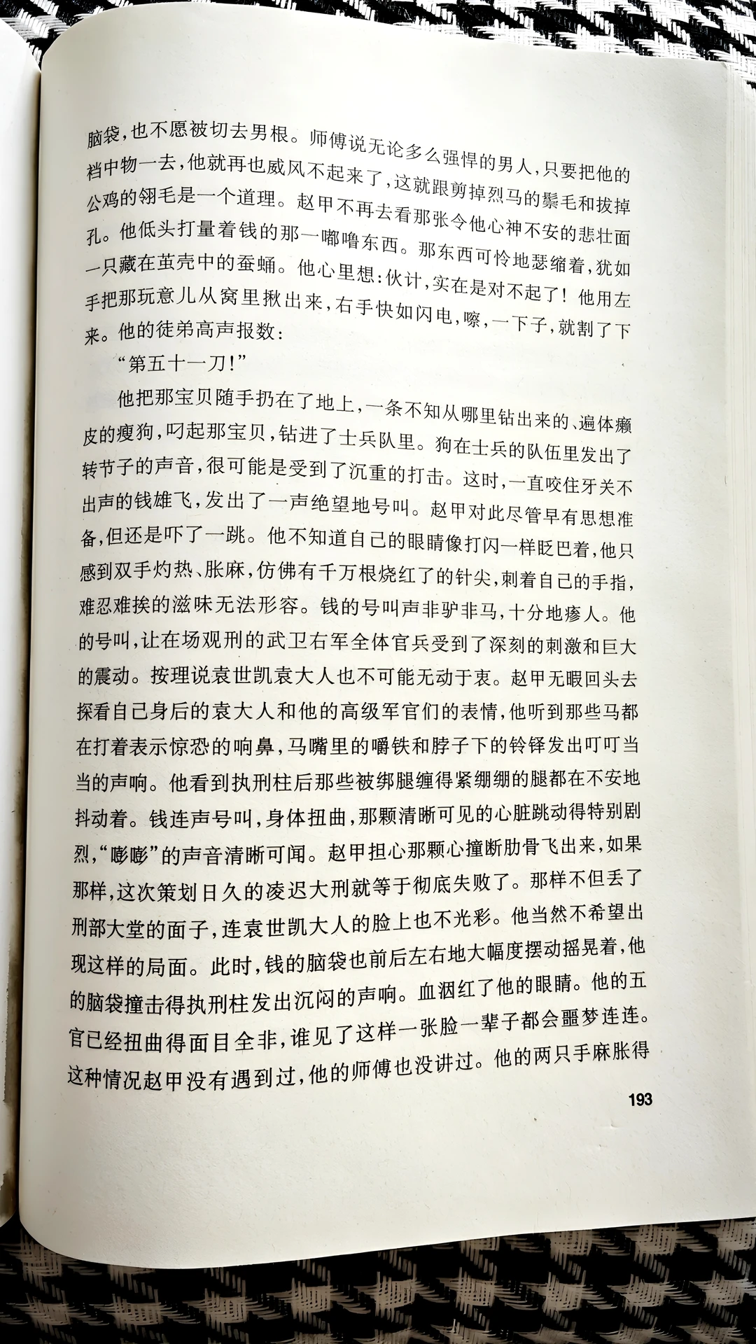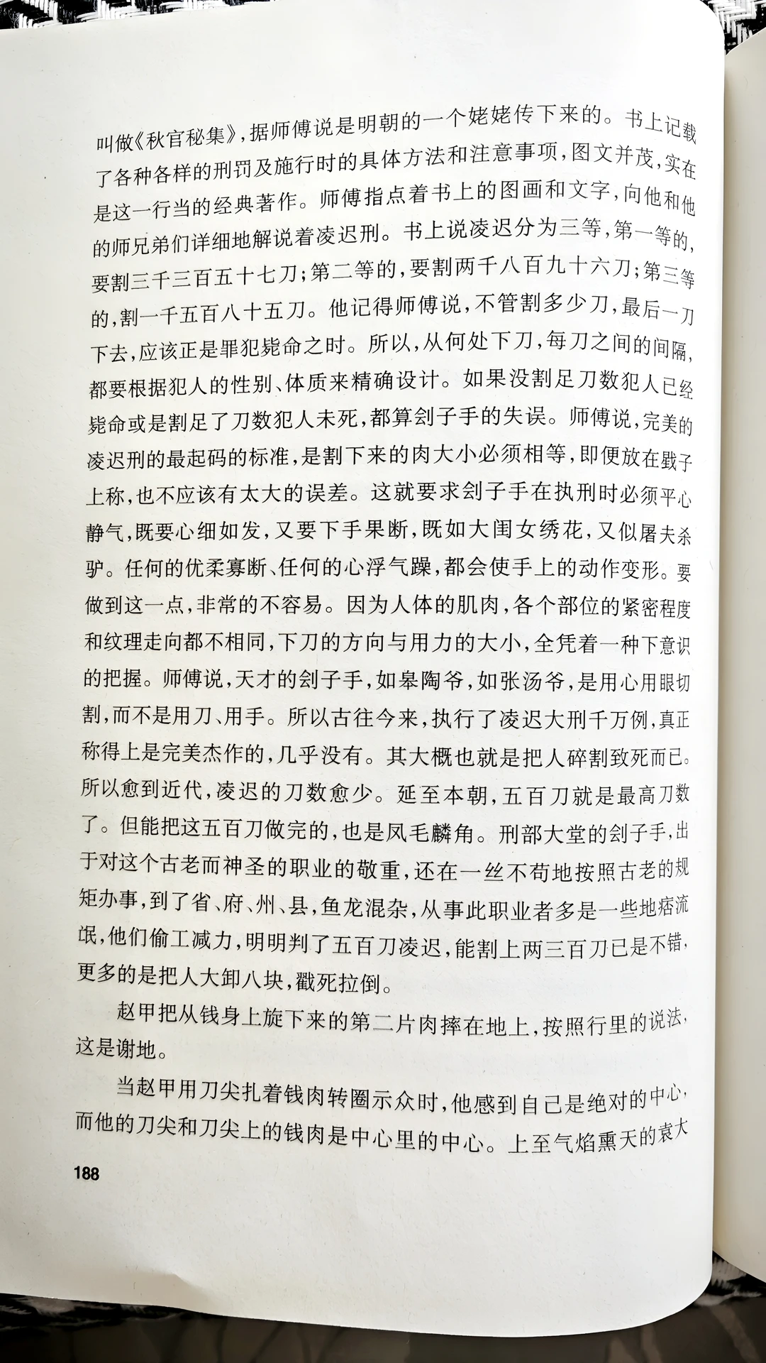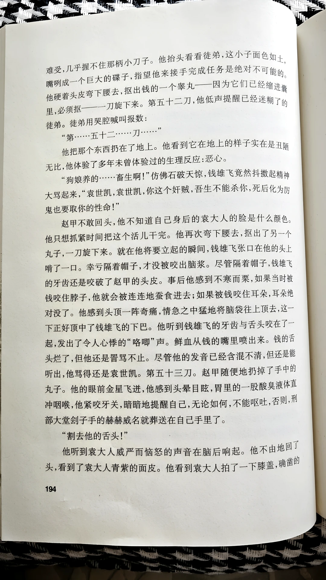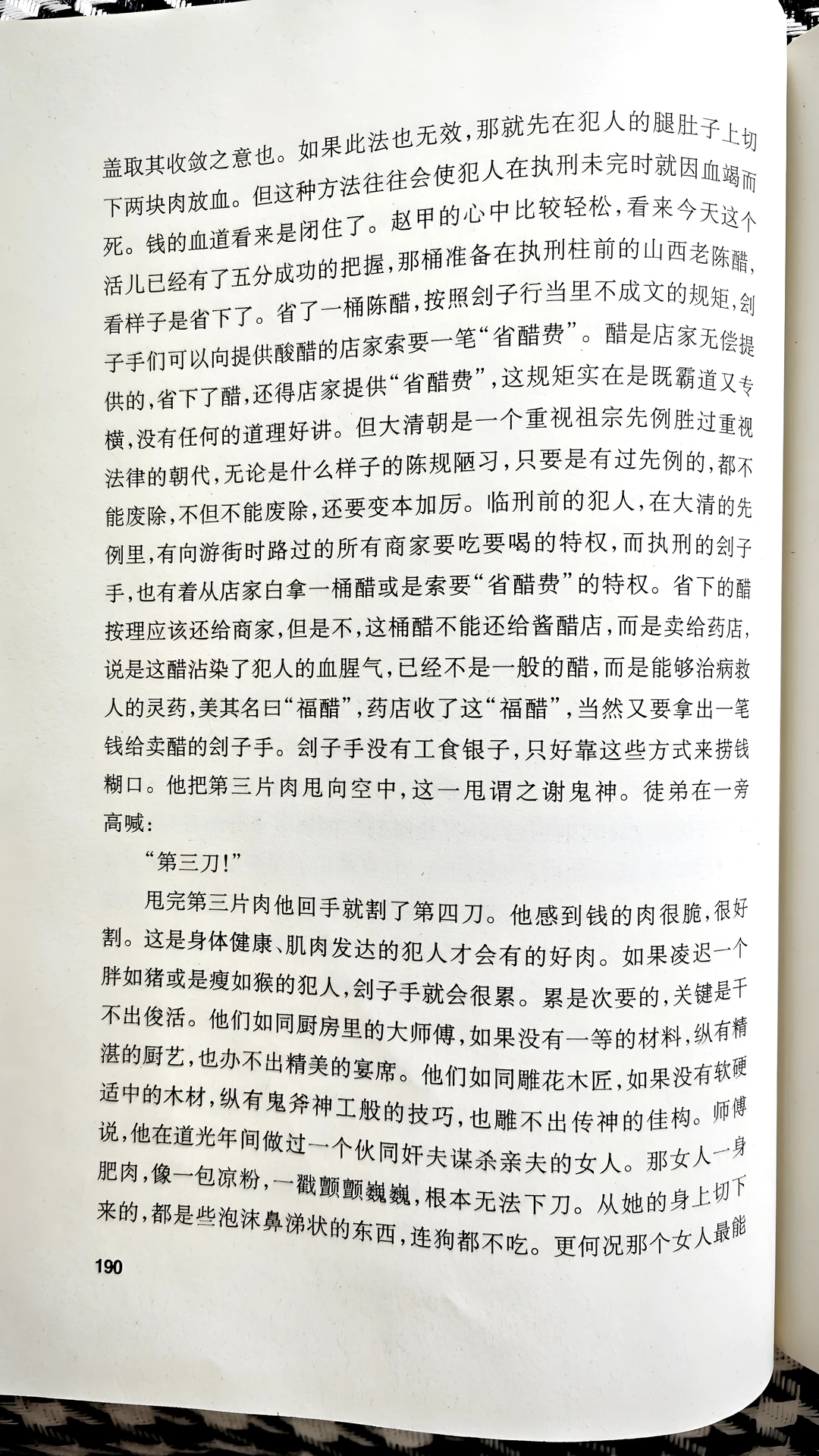 这段内容,是莫言的《檀香刑》里对古代酷刑“凌迟”的还原。刽子手赵甲是刑法执行者,他将杀人变成了“艺术”[石化R] 受刑者是行刺袁世凯未遂的钱雄飞。刑罚的核心要求是: 1.精准(肉片大小均匀)、2.足量(本次刑量定为五百刀,这是清代最高规格)、3.致死(直到最后一刀才能让犯人致命)。 赵甲先猛拍钱雄飞的心窝一掌,封闭钱雄飞的血脉,减缓血液循环,防止大出血,保证行刑过程的清晰度。 从右胸开始,以“鱼鳞割”的手法,每刀旋下铜钱大小的肉片,挑在刀尖示众(谢天、谢地、谢鬼神),并由徒弟高声报数。 然后是四肢与躯干,依次割削双臂、双腿、腹肌及臀部肌肉。过程中赵甲需控制手速与力度,确保在未毙命的前提下完成既定刀数。 身体切割接近尾声后,接着是五官剥夺,进行最后六刀的收尾。依次割下左耳、右耳、双眼、鼻子。 最后第五百刀刺中心脏,挑出心头肉展示,完成行刑。 中途因为袁世凯下令“割去舌头”打乱了程序,刽子手赵甲临时采取泼水封喉、割舌的应急手段,并通过自残大腿提神,强行完成了五百刀的定额。 莫言的这段描述已经超越了单纯的感官刺激, 他对每一刀的部位、形状、分量都精准描写,这种近乎科学的冷静叙述,与残酷的肉体伤害形成强烈反差,产生了一种惊悚的审美距离。 全程大量运用了视觉(“鲜红如枣”、“黑色暗血如熬糊的糖稀”)、听觉(“嗞嗞”声、“嘭嘭”心跳声)、触觉(“肉脆”、“灼热”)等多重感官叠加,将我们强行拉入到刑场现场,感觉到了一种沉浸式观刑体验。 赵甲追求的不是杀戮的快感,而是“完美的杰作”与“不能亵渎大清律令”。 钱雄飞则从视死如归到绝望嘶吼,以及士兵、官员面对血腥时的惊恐,这种种极端的情绪与感官刺激相互缠绕,最终在猫腔凄厉的调子里,凝成了一声穿透历史、令人不寒而栗的叹息。 大量使用直白、粗粝甚至带有生理不适感的词汇,拒绝粉饰刑法细节,以最原始的语言冲击力,完成从肉体施虐向精神拷问的剧烈升华 。