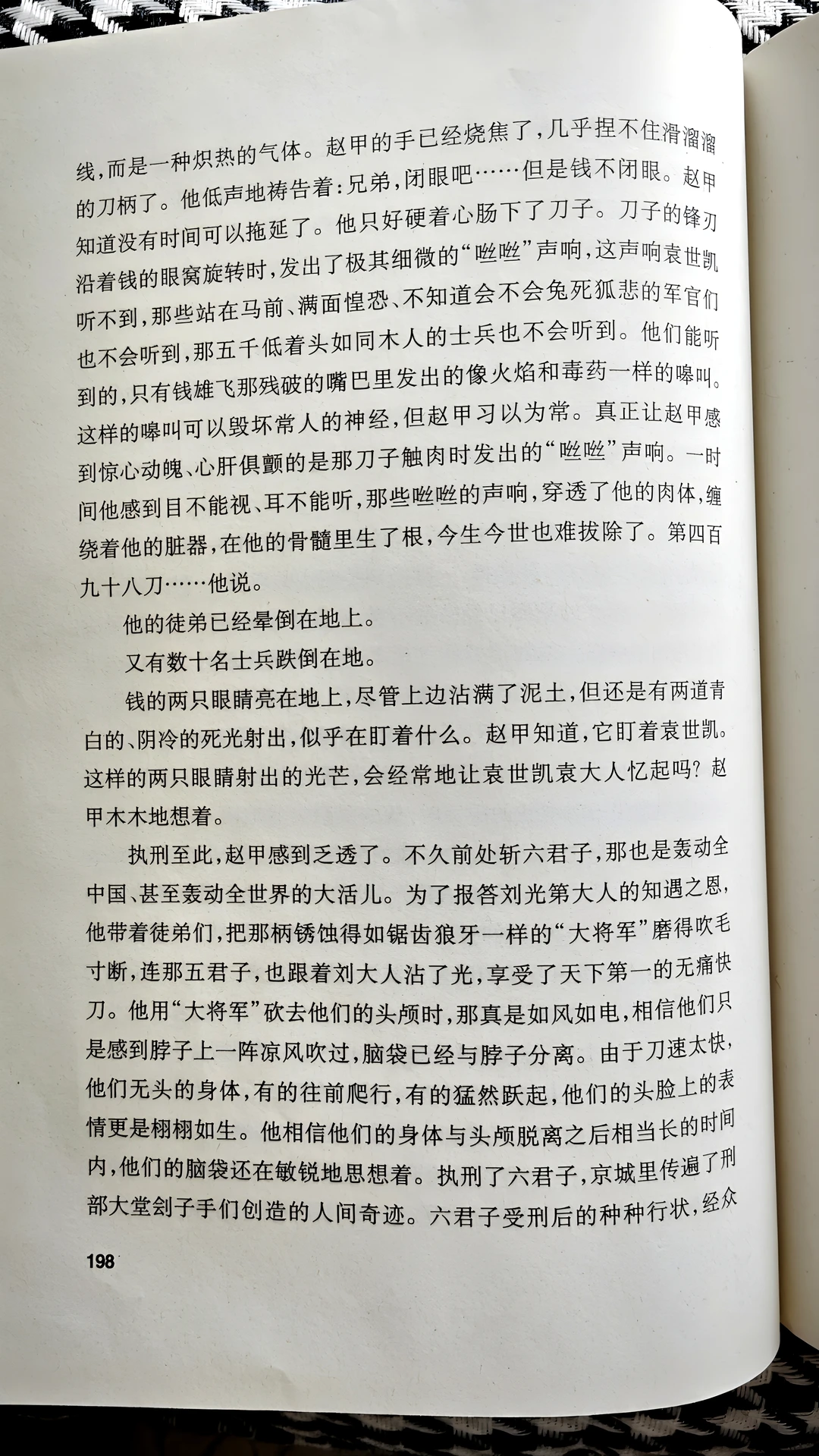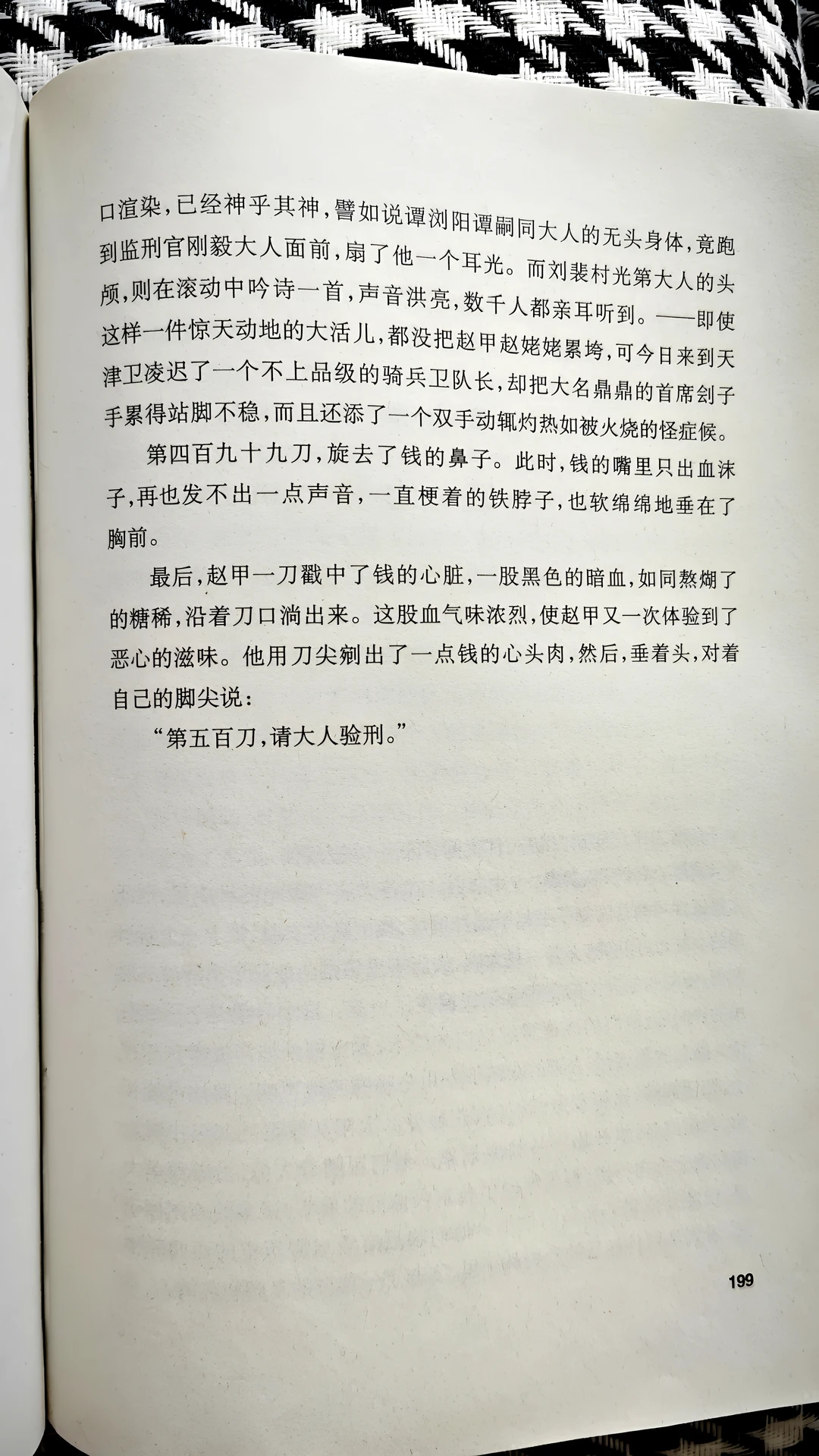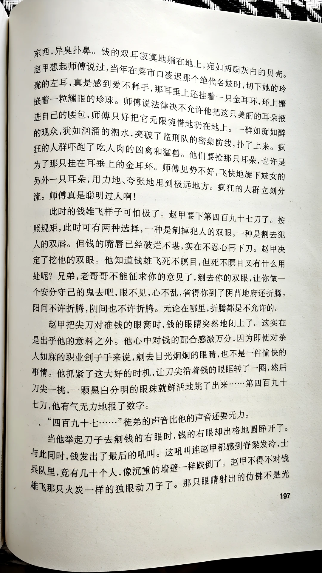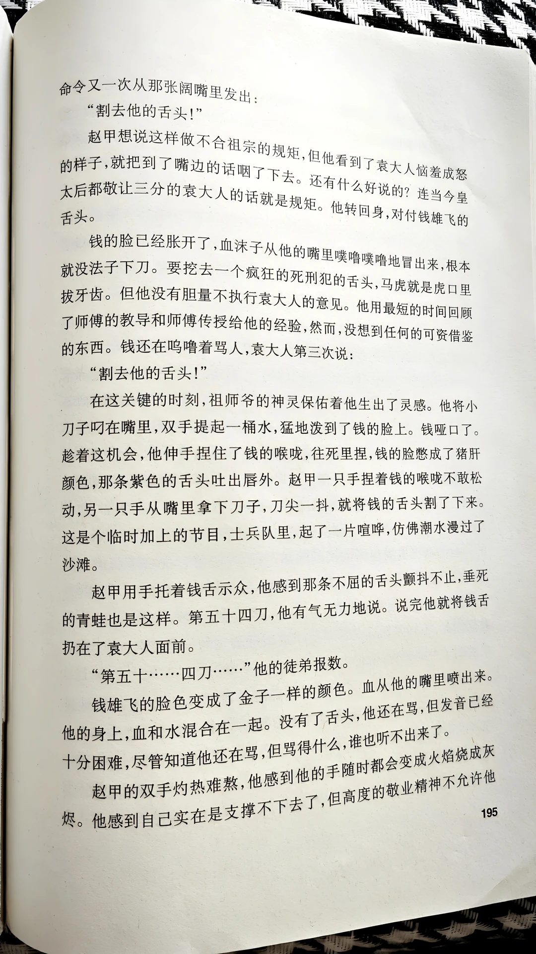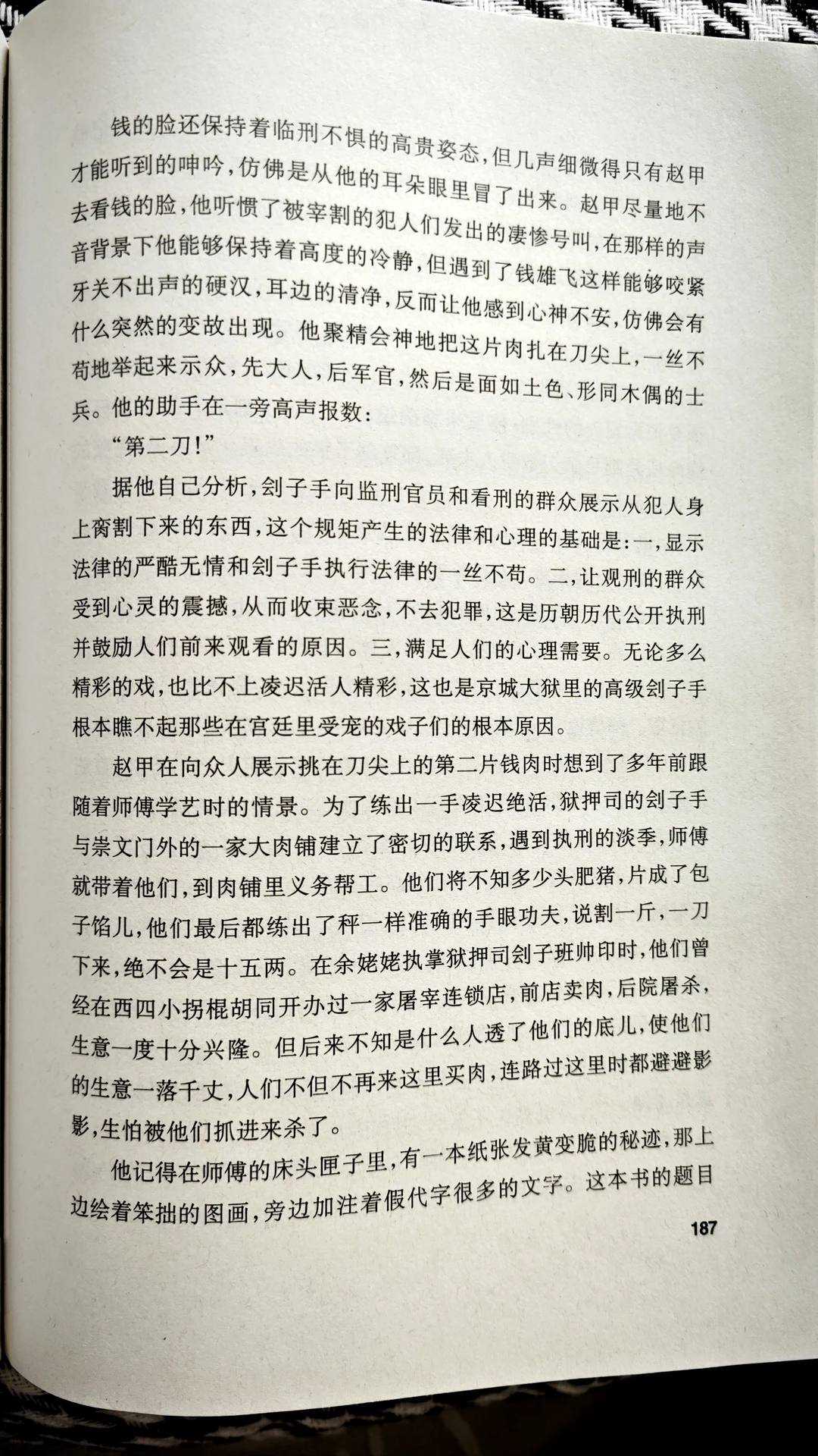 这段内容,是莫言的《檀香刑》里对古代酷刑“凌迟”的还原。刽子手赵甲是刑法执行者,他将杀人变成了“艺术”[石化R] 受刑者是行刺袁世凯未遂的钱雄飞。刑罚的核心要求是: 1.精准(肉片大小均匀)、2.足量(本次刑量定为五百刀,这是清代最高规格)、3.致死(直到最后一刀才能让犯人致命)。 赵甲先猛拍钱雄飞的心窝一掌,封闭钱雄飞的血脉,减缓血液循环,防止大出血,保证行刑过程的清晰度。 从右胸开始,以“鱼鳞割”的手法,每刀旋下铜钱大小的肉片,挑在刀尖示众(谢天、谢地、谢鬼神),并由徒弟高声报数。 然后是四肢与躯干,依次割削双臂、双腿、腹肌及臀部肌肉。过程中赵甲需控制手速与力度,确保在未毙命的前提下完成既定刀数。 身体切割接近尾声后,接着是五官剥夺,进行最后六刀的收尾。依次割下左耳、右耳、双眼、鼻子。 最后第五百刀刺中心脏,挑出心头肉展示,完成行刑。 中途因为袁世凯下令“割去舌头”打乱了程序,刽子手赵甲临时采取泼水封喉、割舌的应急手段,并通过自残大腿提神,强行完成了五百刀的定额。 莫言的这段描述已经超越了单纯的感官刺激, 他对每一刀的部位、形状、分量都精准描写,这种近乎科学的冷静叙述,与残酷的肉体伤害形成强烈反差,产生了一种惊悚的审美距离。 全程大量运用了视觉(“鲜红如枣”、“黑色暗血如熬糊的糖稀”)、听觉(“嗞嗞”声、“嘭嘭”心跳声)、触觉(“肉脆”、“灼热”)等多重感官叠加,将我们强行拉入到刑场现场,感觉到了一种沉浸式观刑体验。 赵甲追求的不是杀戮的快感,而是“完美的杰作”与“不能亵渎大清律令”。 钱雄飞则从视死如归到绝望嘶吼,以及士兵、官员面对血腥时的惊恐,这种种极端的情绪与感官刺激相互缠绕,最终在猫腔凄厉的调子里,凝成了一声穿透历史、令人不寒而栗的叹息。 大量使用直白、粗粝甚至带有生理不适感的词汇,拒绝粉饰刑法细节,以最原始的语言冲击力,完成从肉体施虐向精神拷问的剧烈升华 。