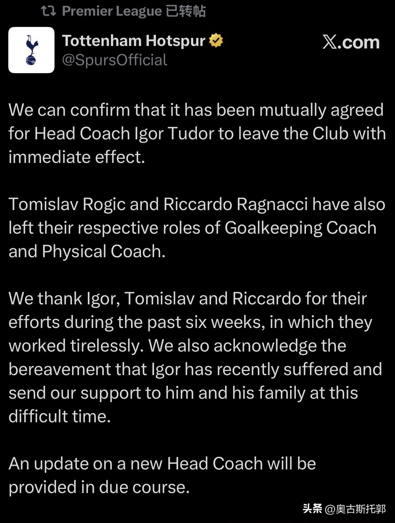 该来的还是来了,热刺加油,好戏全靠你了! 图多尔 也算解脱了[呲牙][呲牙][呲牙] ………………………………………………………… 我们可以确认,主教练Igor Tudor已达成双方同意立即离开俱乐部。 托米斯拉夫·罗吉奇和里卡多·拉尼亚奇也离开了各自的守门员教练和物理教练。 我们感谢Igor、Tomislav和Riccardo在过去六周的努力,他们不知疲倦地工作。我们也承认伊戈尔最近遭受的丧亲,并在这个困难时期向他和他的家人表示支持。 新主教练的最新情况将在适当的时候提供。